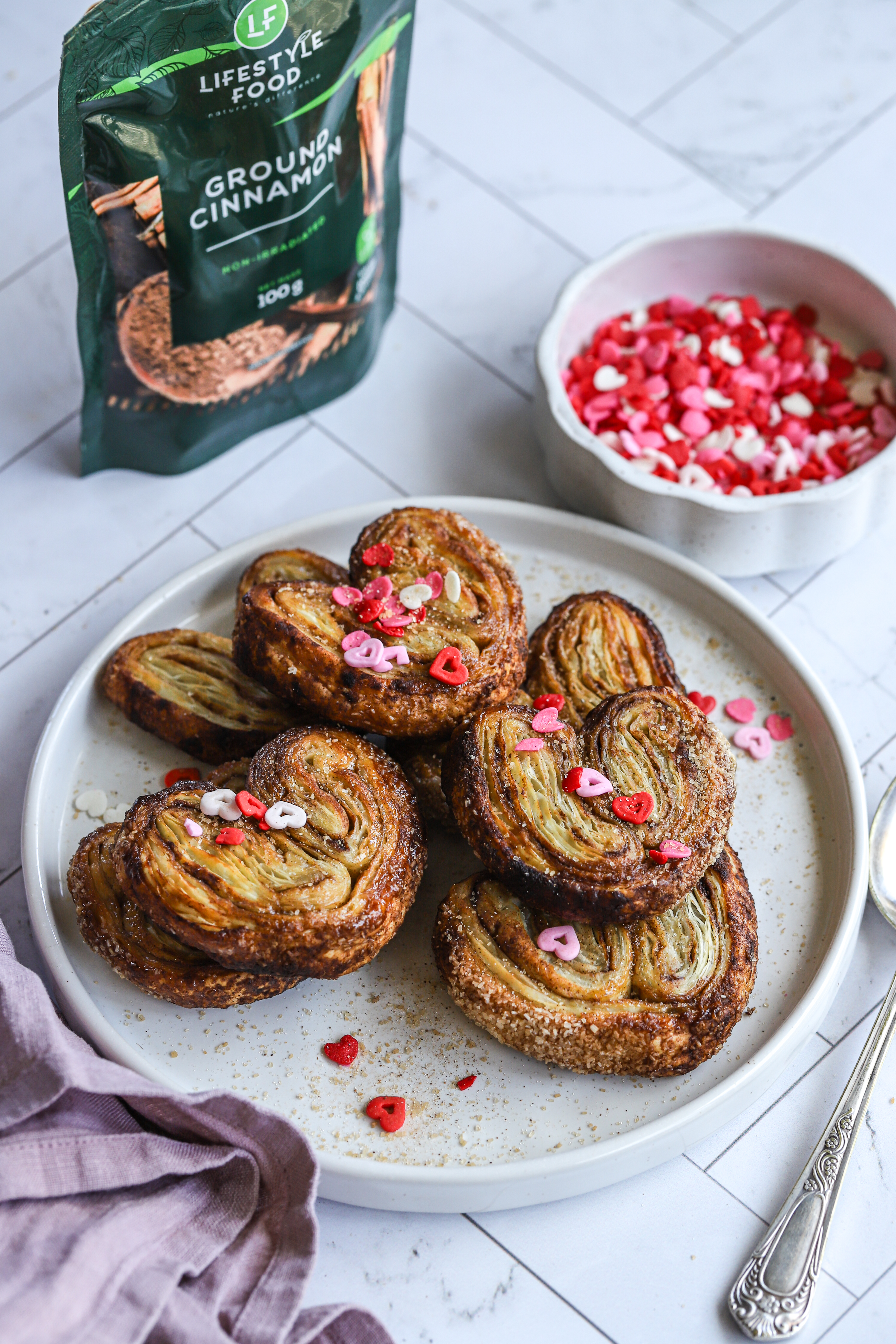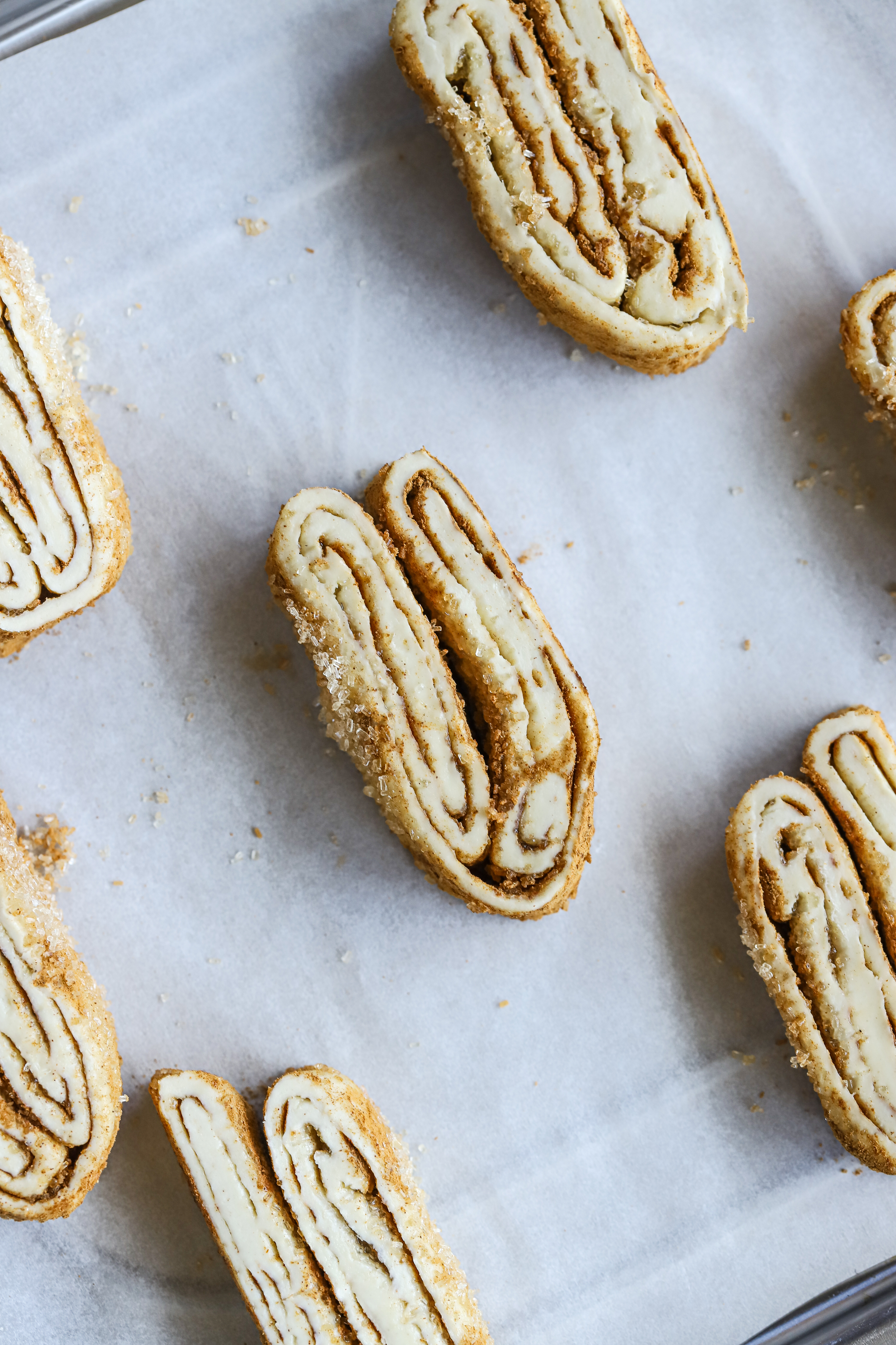 1. Sprinkle on a baking paper, lay out the puff pastry, and then sprinkle on more cinnamon and sugar. 2. Fold over both edges, sprinkle with more cinnamon sugar, and use a rolling pin to roll flat. Fold over again and repeat this process until the edges almond meet, leaving 2 cm space open in between. 3. Fold the two edges on top of each other until you have a pretty folded envelope, chill the dough for about 30-60 minutes, and slice into 1cm cookies. 4. Place on a parchment paper-lined tray, bake for 20-30 minutes at 180 degrees Celsius, flip halfway over, and bake again until golden brown. 5. Serve and enjoy!