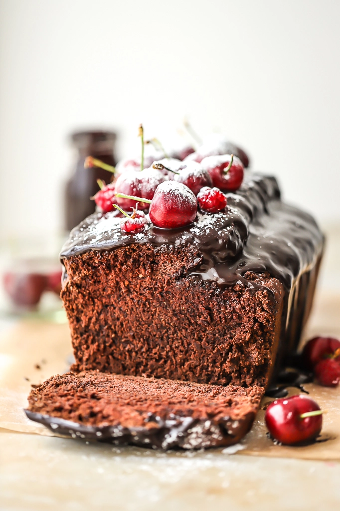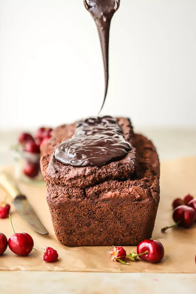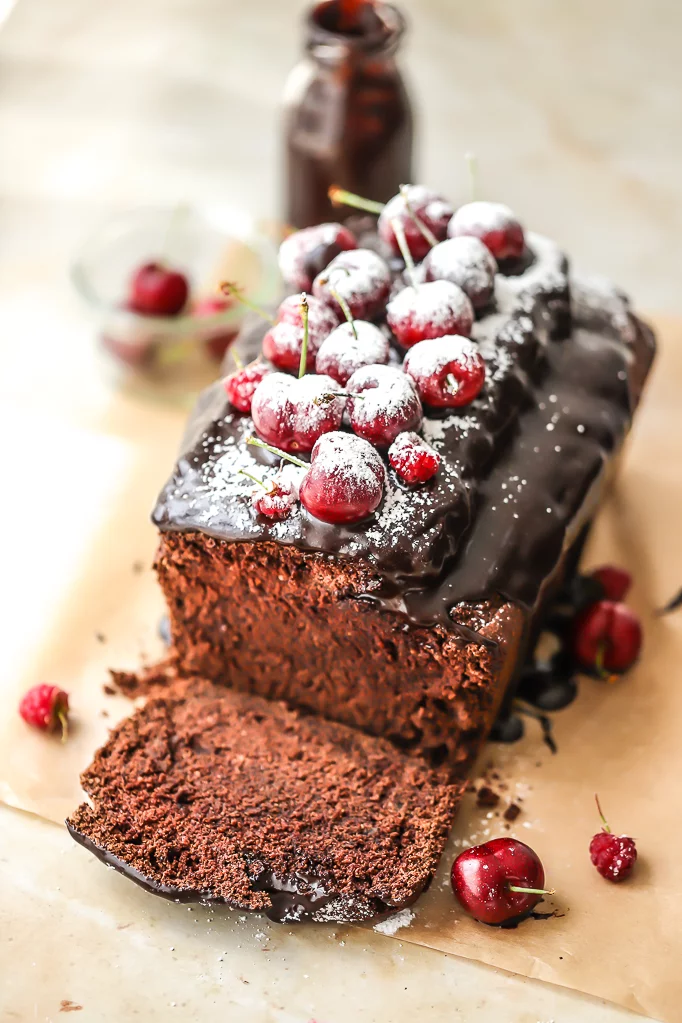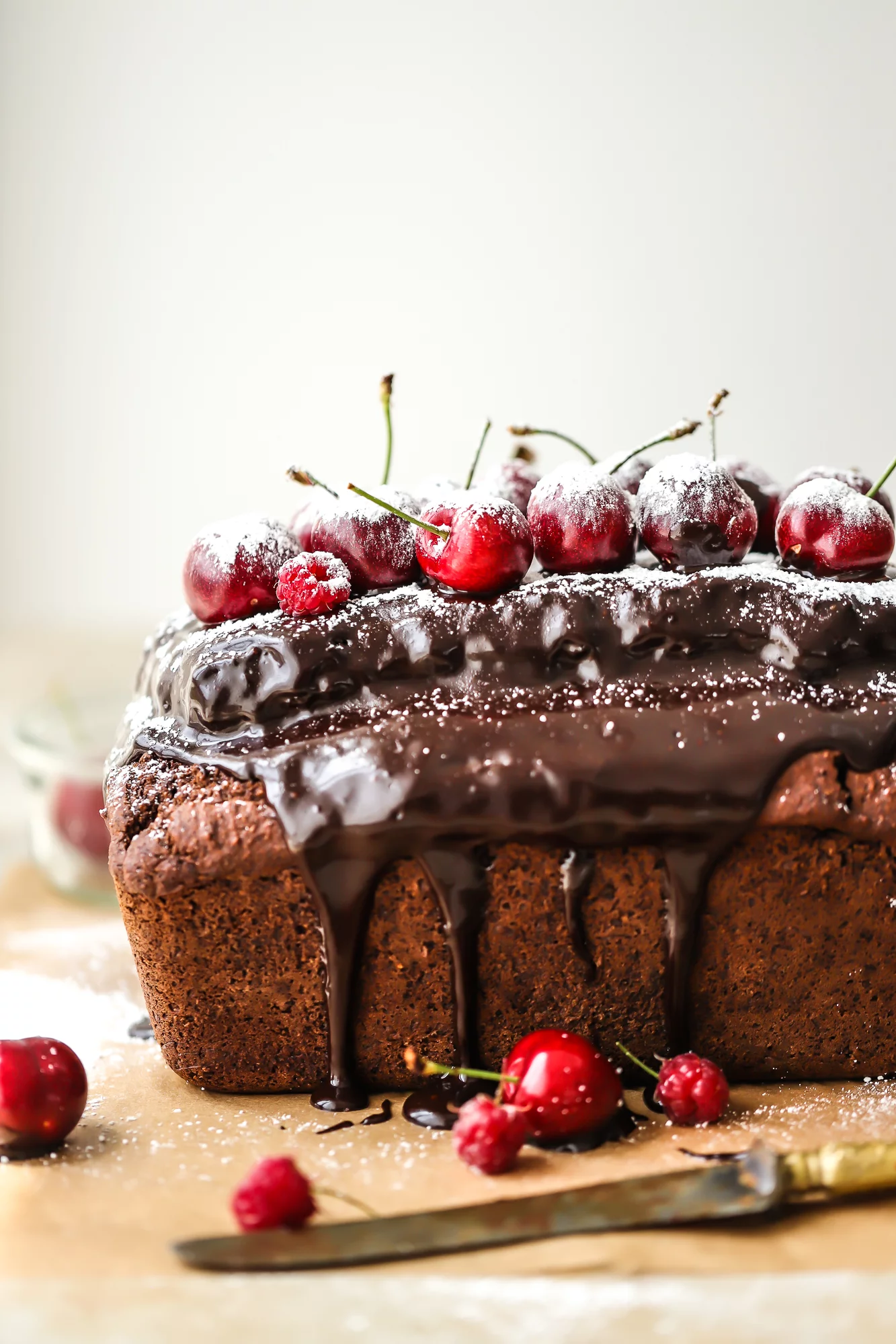 - For the ganache- melt the chocolate slowly pour in the coconut cream and whisk well until it starts to thicken. Pour over the loaf, and let it set slightly before adding the cherries, slice and serve!