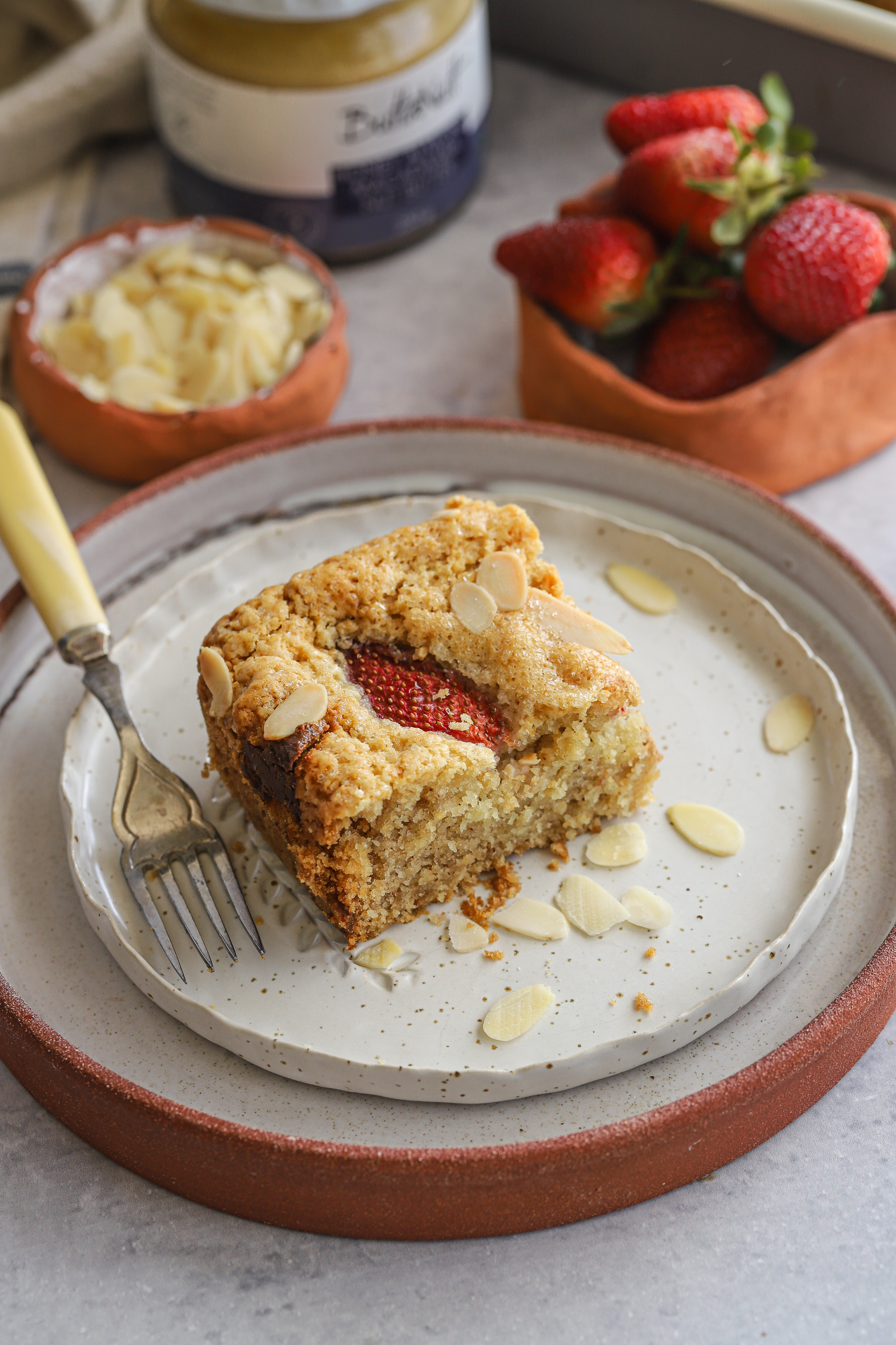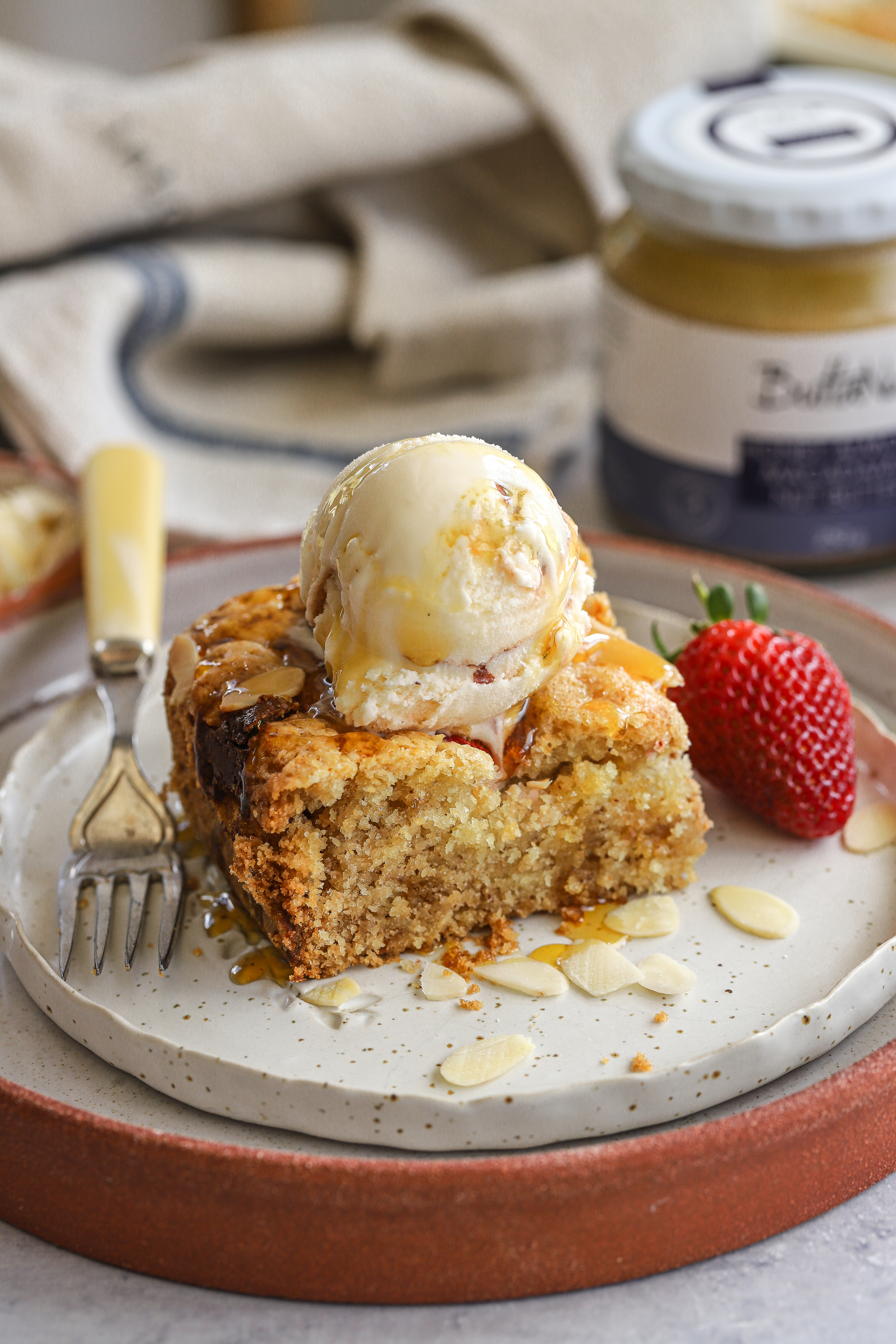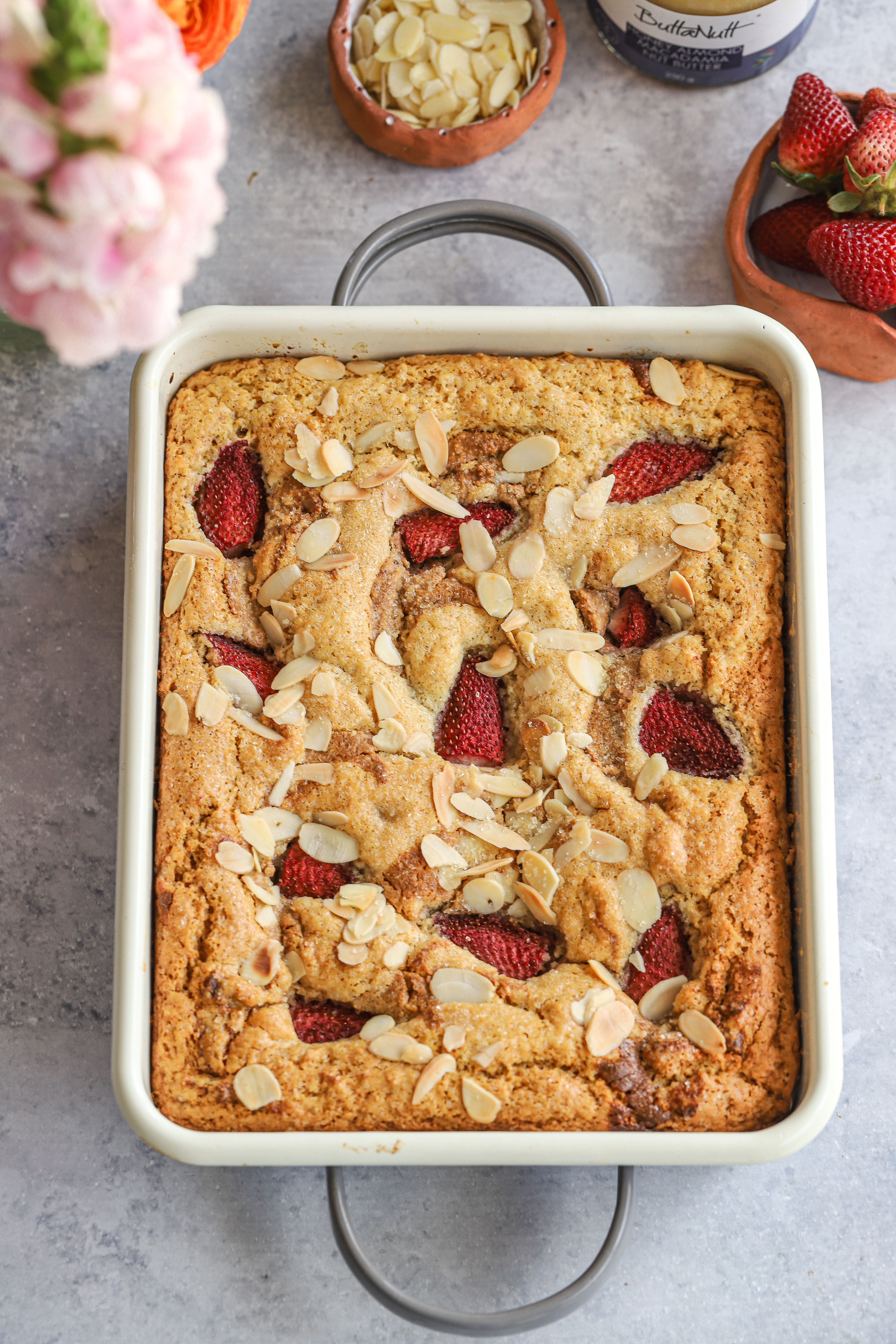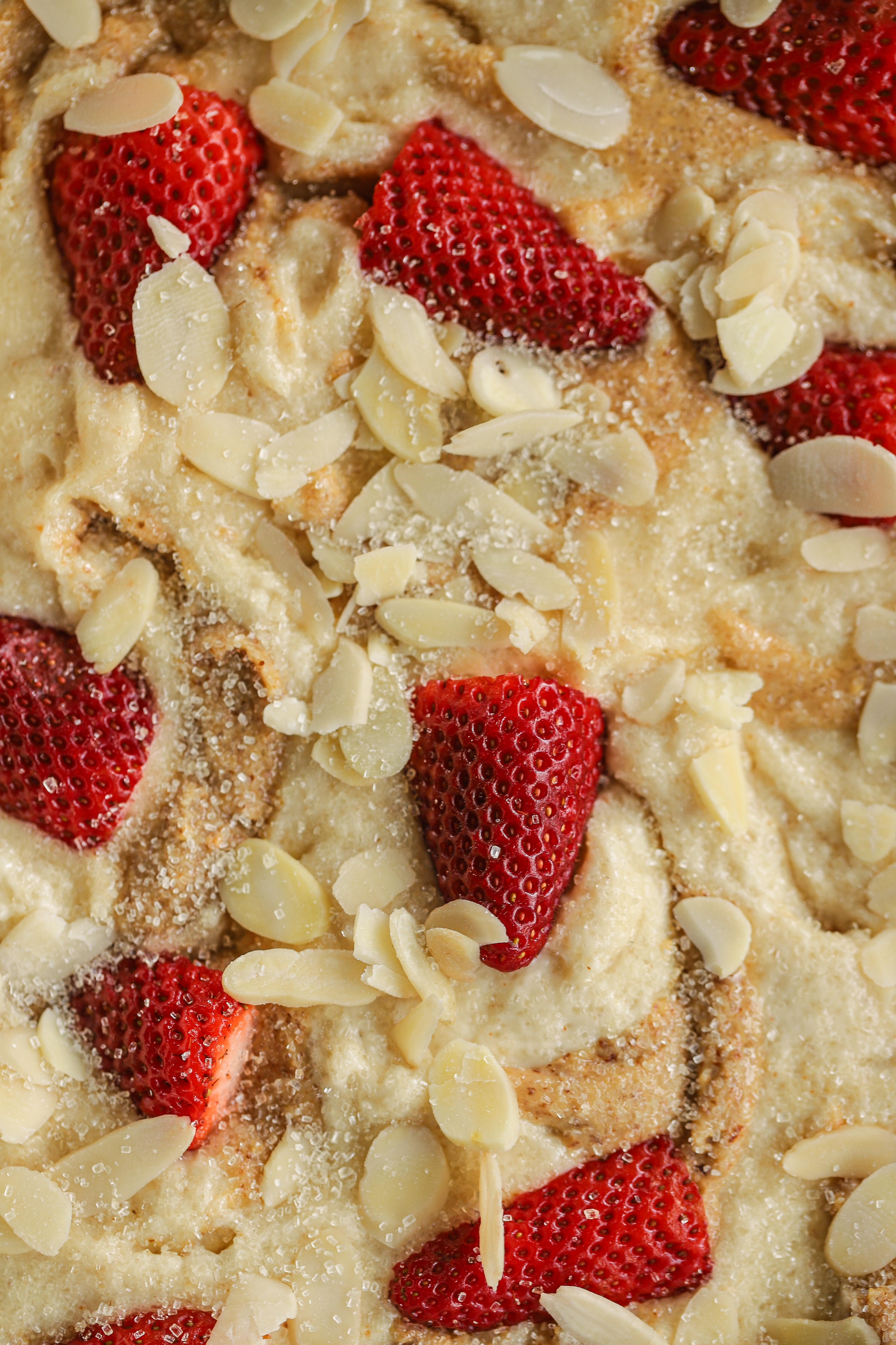 5. Add dollops of Almond honey butter on top and make swirls with a knife. Add the fresh strawberries, almond slivers, and drizzle over more honey before baking.