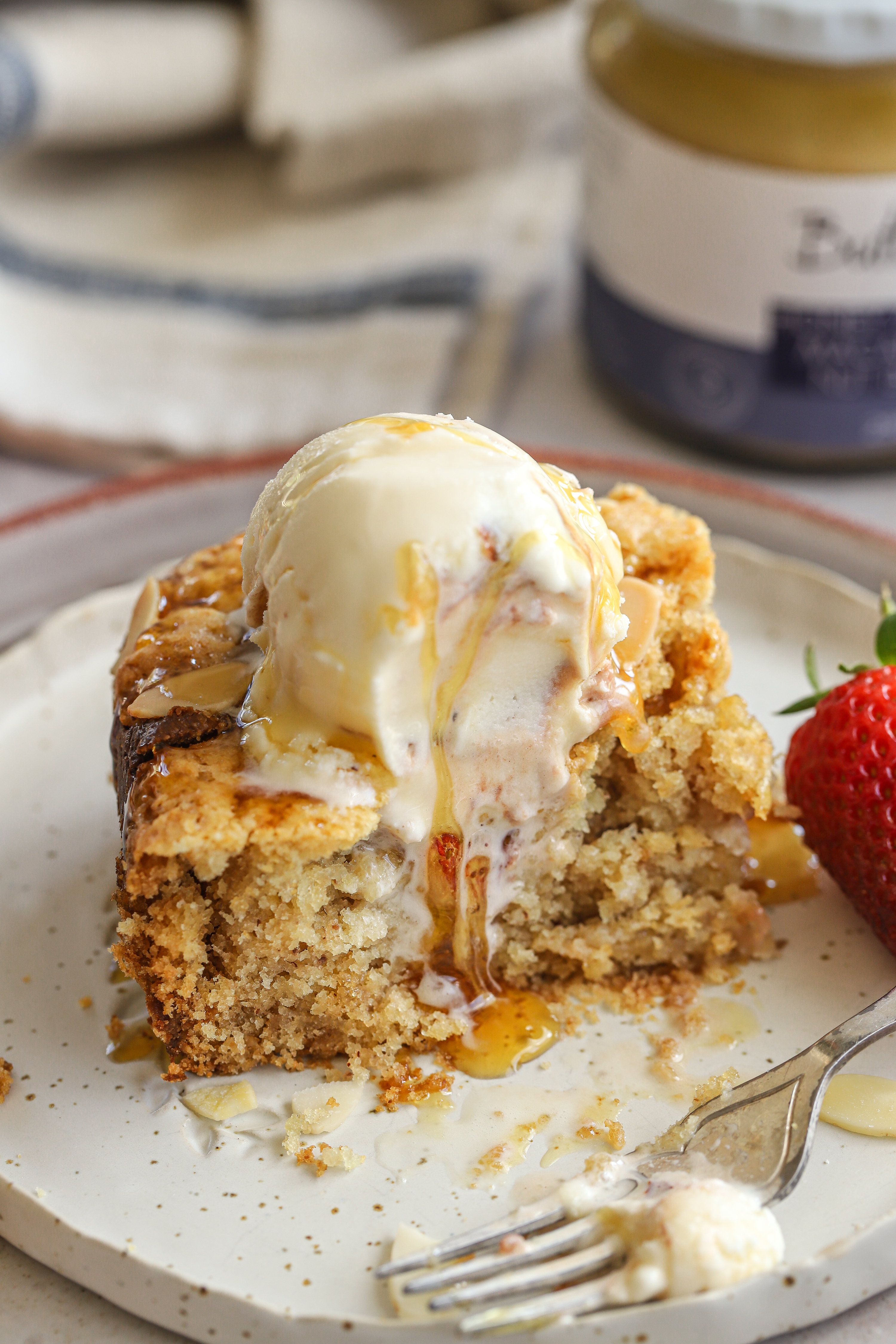 7. Let the cake cool completely before slicing. Serve with vegan ice cream or whipped coconut cream and a drizzle of honey, and enjoy!