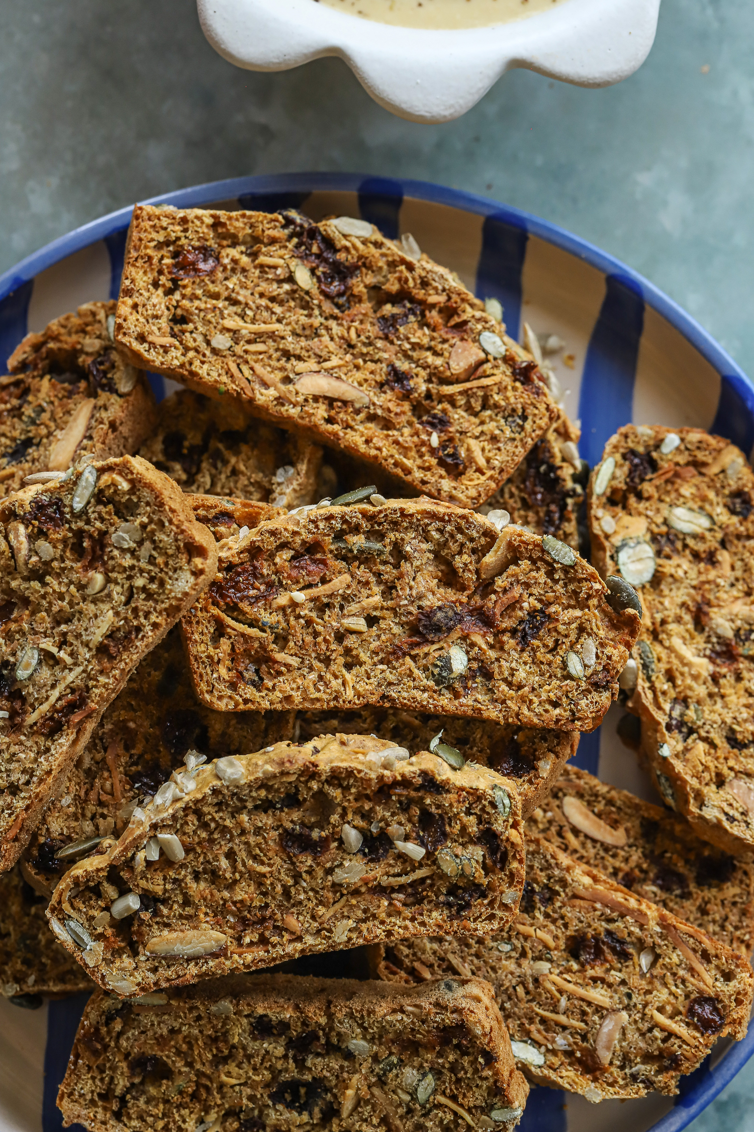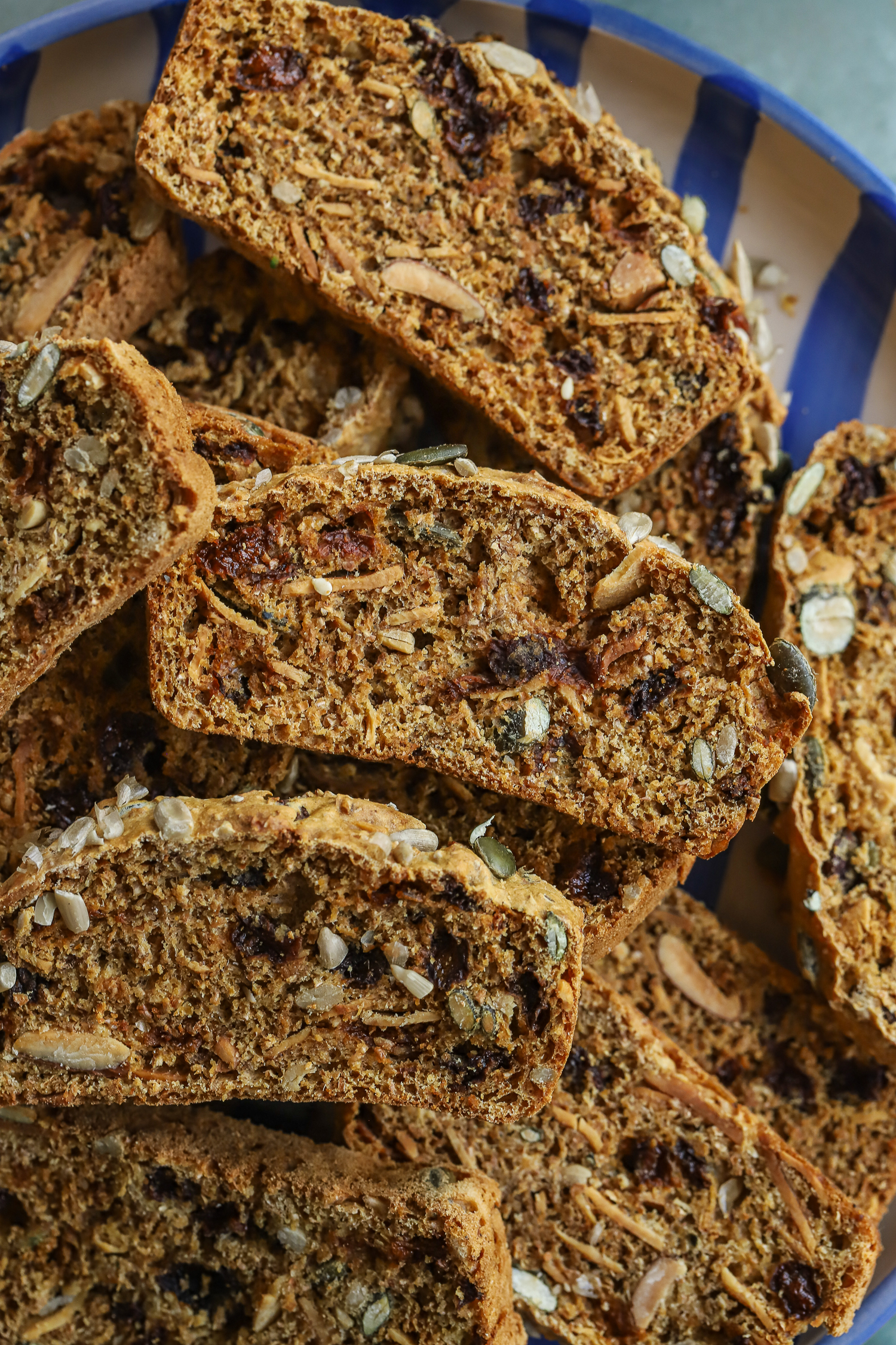 Add both flours, baking soda, salt, herbs, cinnamon, nutmeg, pepper, soaked and drained dried fruit, nuts, and zest to a large mixing bowl. Stir until well combined. Stir in the milk and honey until well combined, with no streaks of honey remaining.