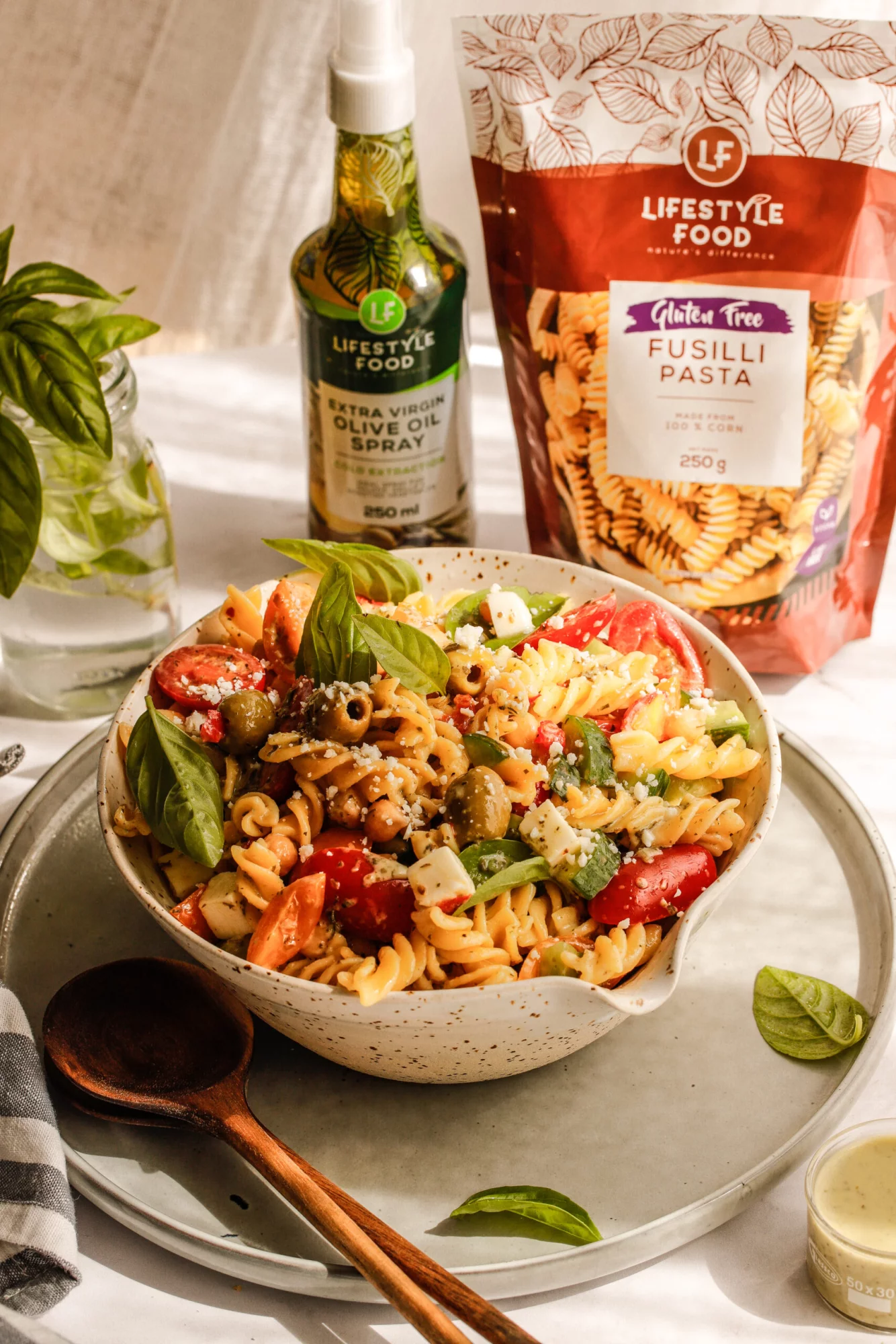 1. Cook the pasta according to packet instructions, dice the tomatoes, and cucumber, and drain the olives.
