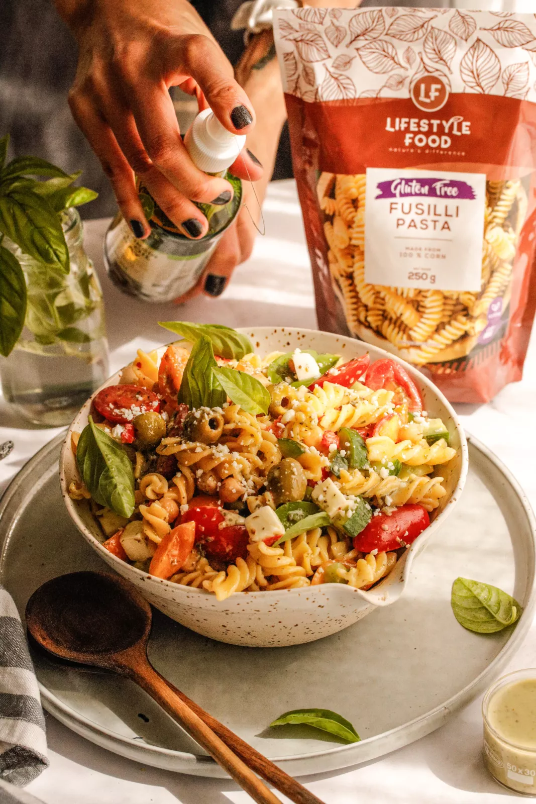 3. Blend the dressing ingredients together until smooth and pour over the cooled pasta, add in the chickpeas, tomatoes, cucumber, olives, and cubed feta.
