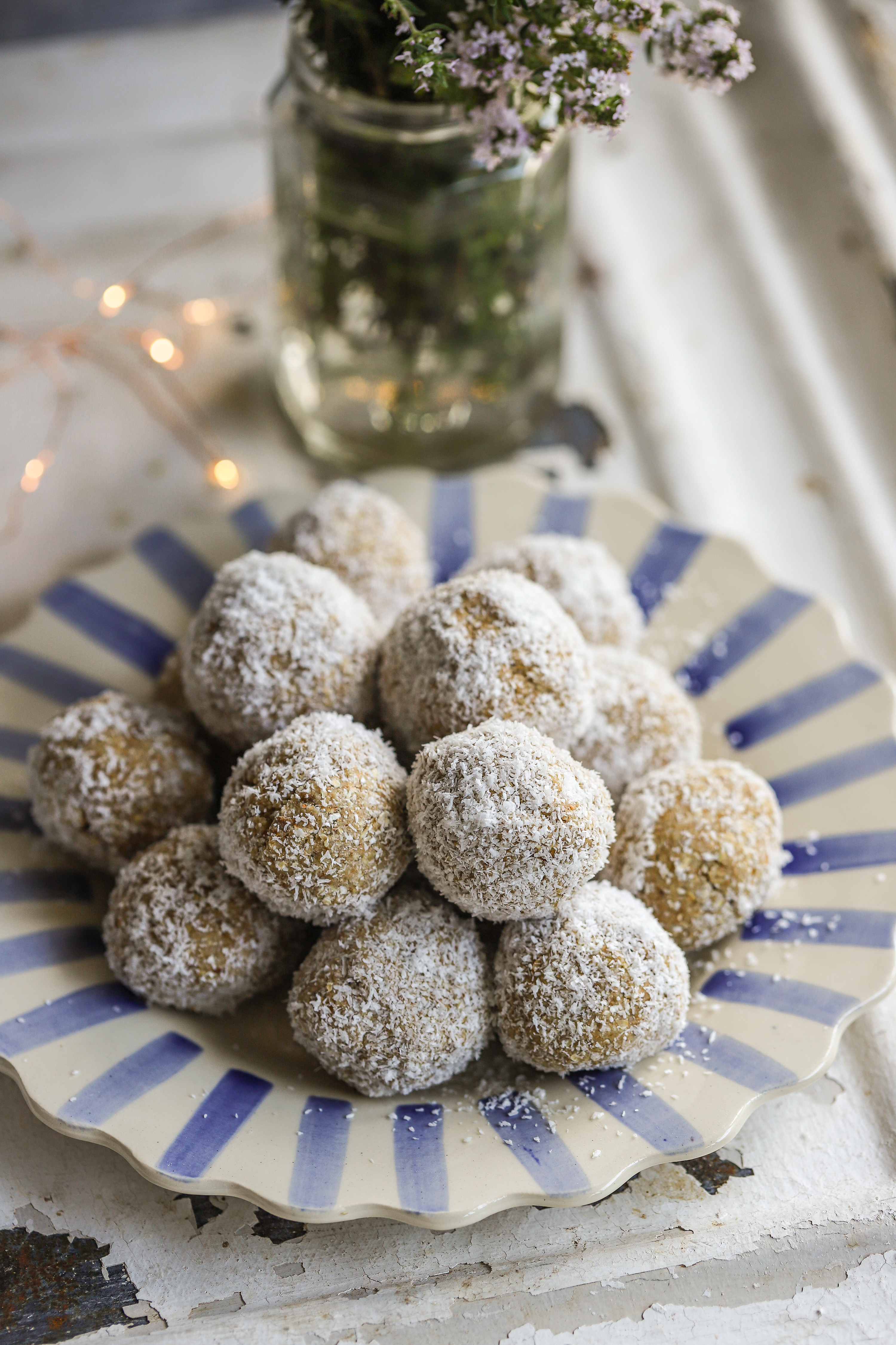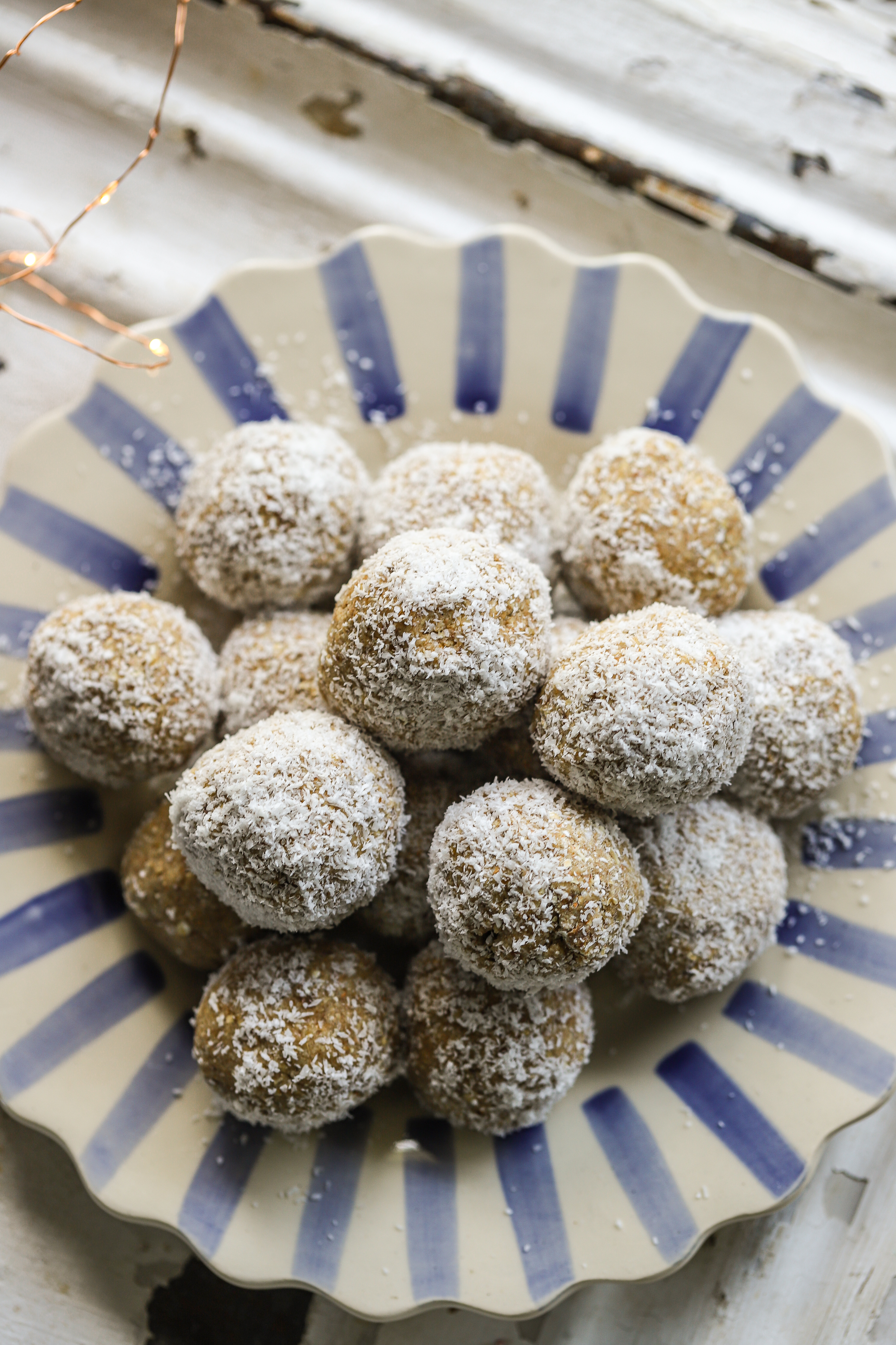 1. Add the dry ingredients to a bowl, then gradually add the milk, nut butter, and sweetener, along with the spices and salt, and mix well until you have a pliable dough. 2. Roll the dough into balls and roll in coconut, cool until set, and enjoy as a dessert or snack!