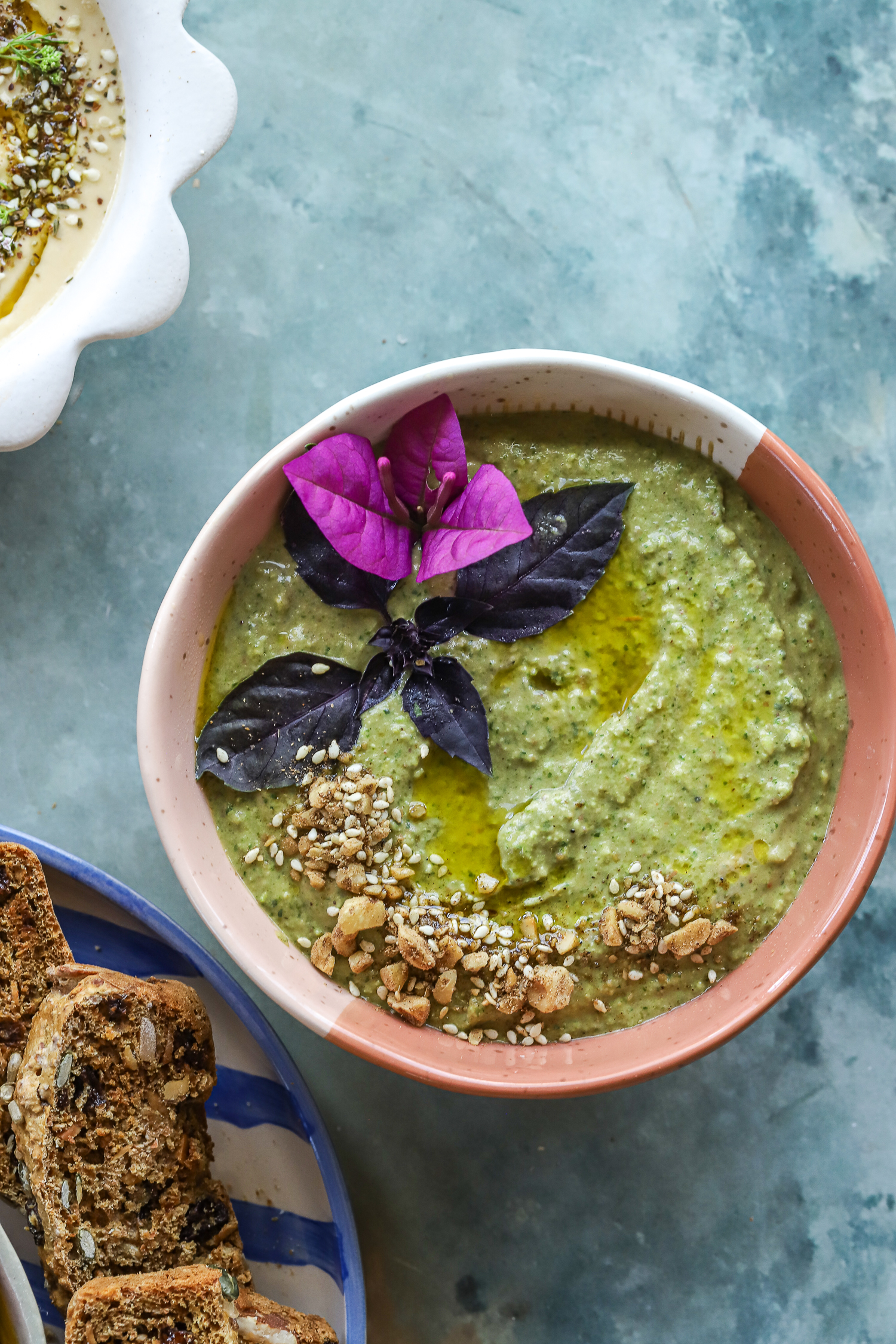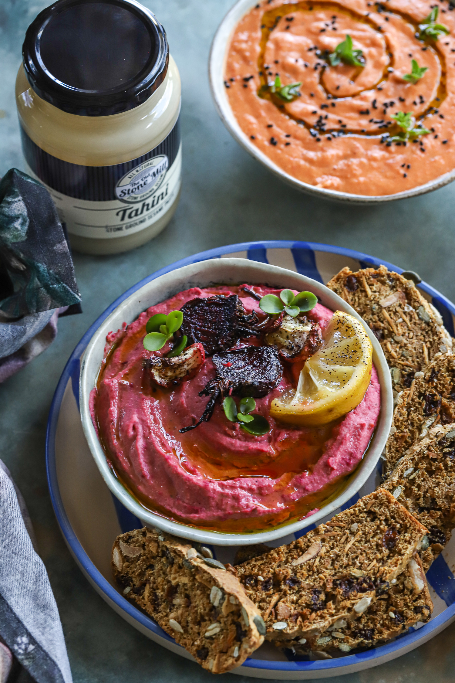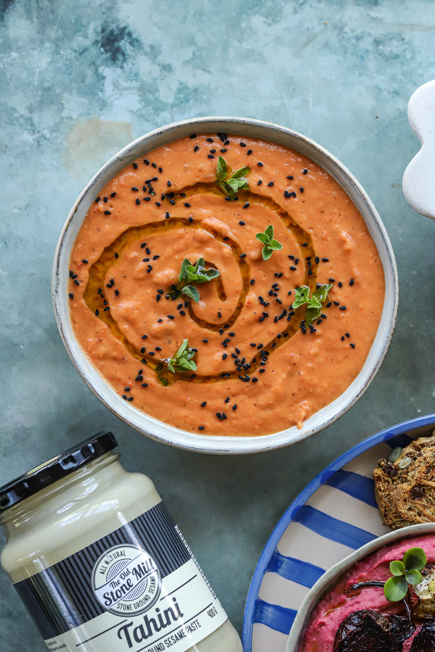 For the various hummus flavours, divide the hummus into two parts, and add the desired veggies for the various flavours.