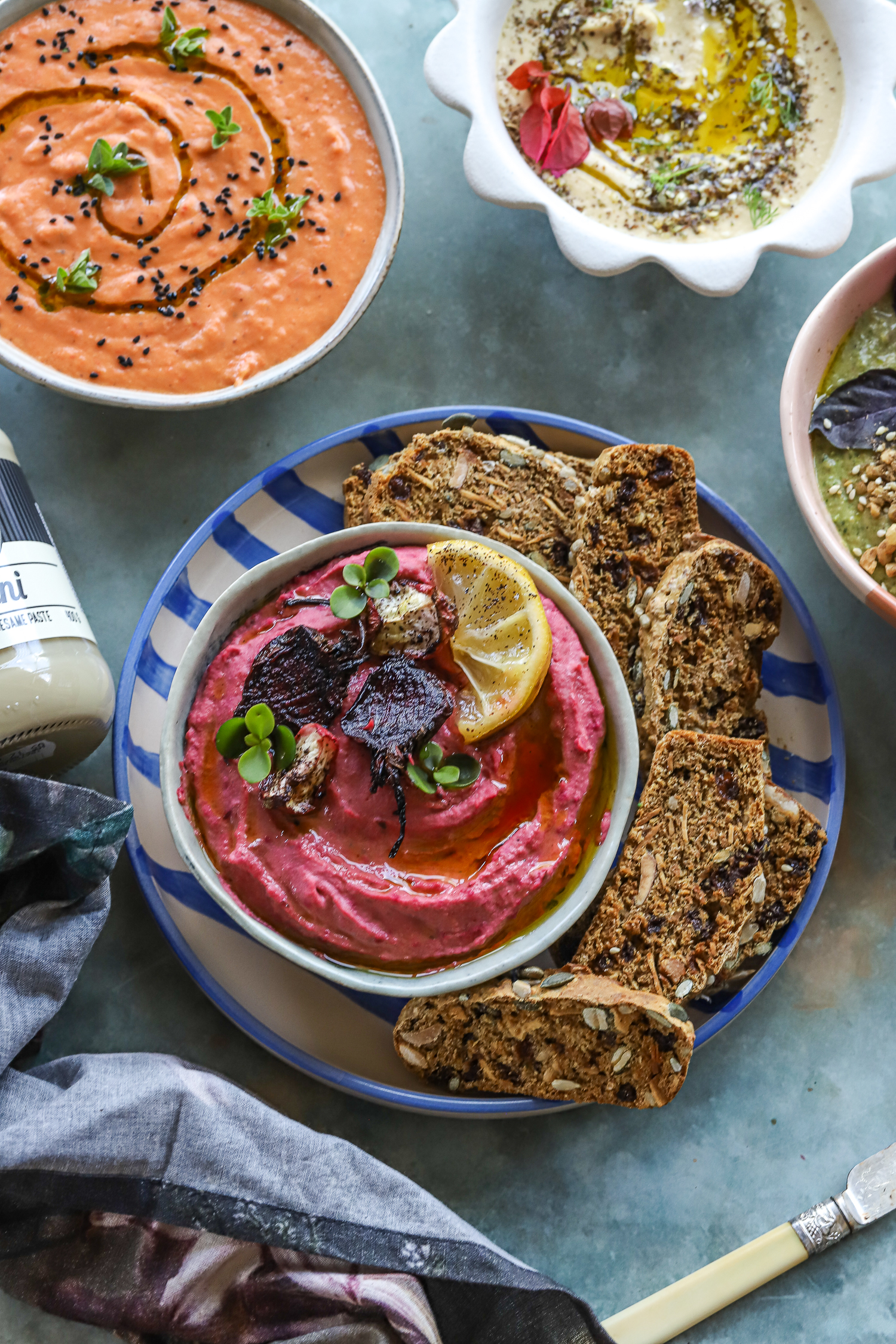 Slice the vegetables, roast the different veggies in separate pans, and top with the salt, pepper, and olive oil. Roast until beautifully fragrant, and let it cool before adding to the hummus.