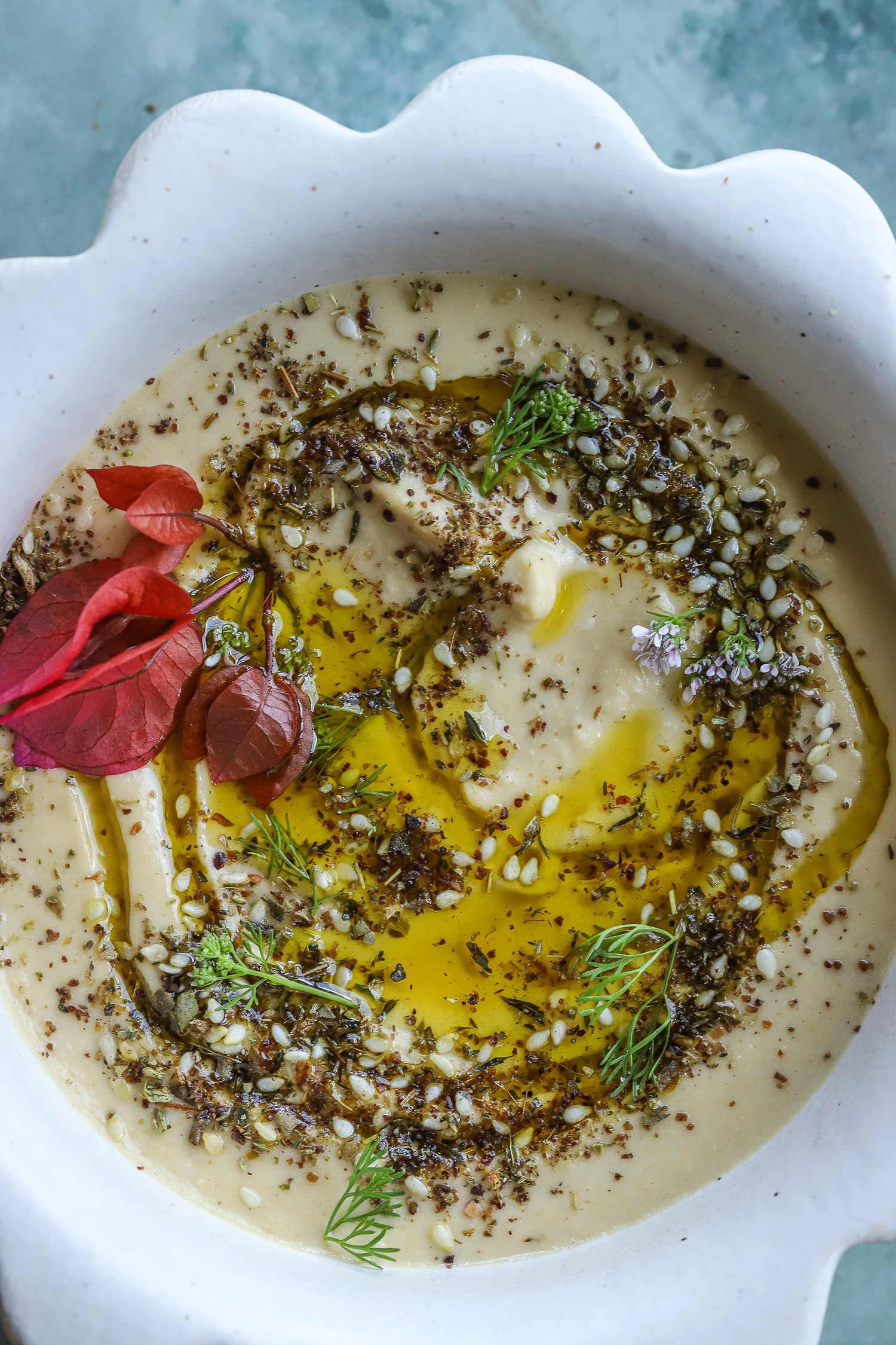 Drain the beans or chickpeas slightly, add to a blender or blend with a hand blender with 1/4 cup of Tahini, 1-2 tbsp lemon juice, salt and pepper to taste, and a drizzle of olive oil. Add 1-2 cubes of ice to make the hummus creamier.