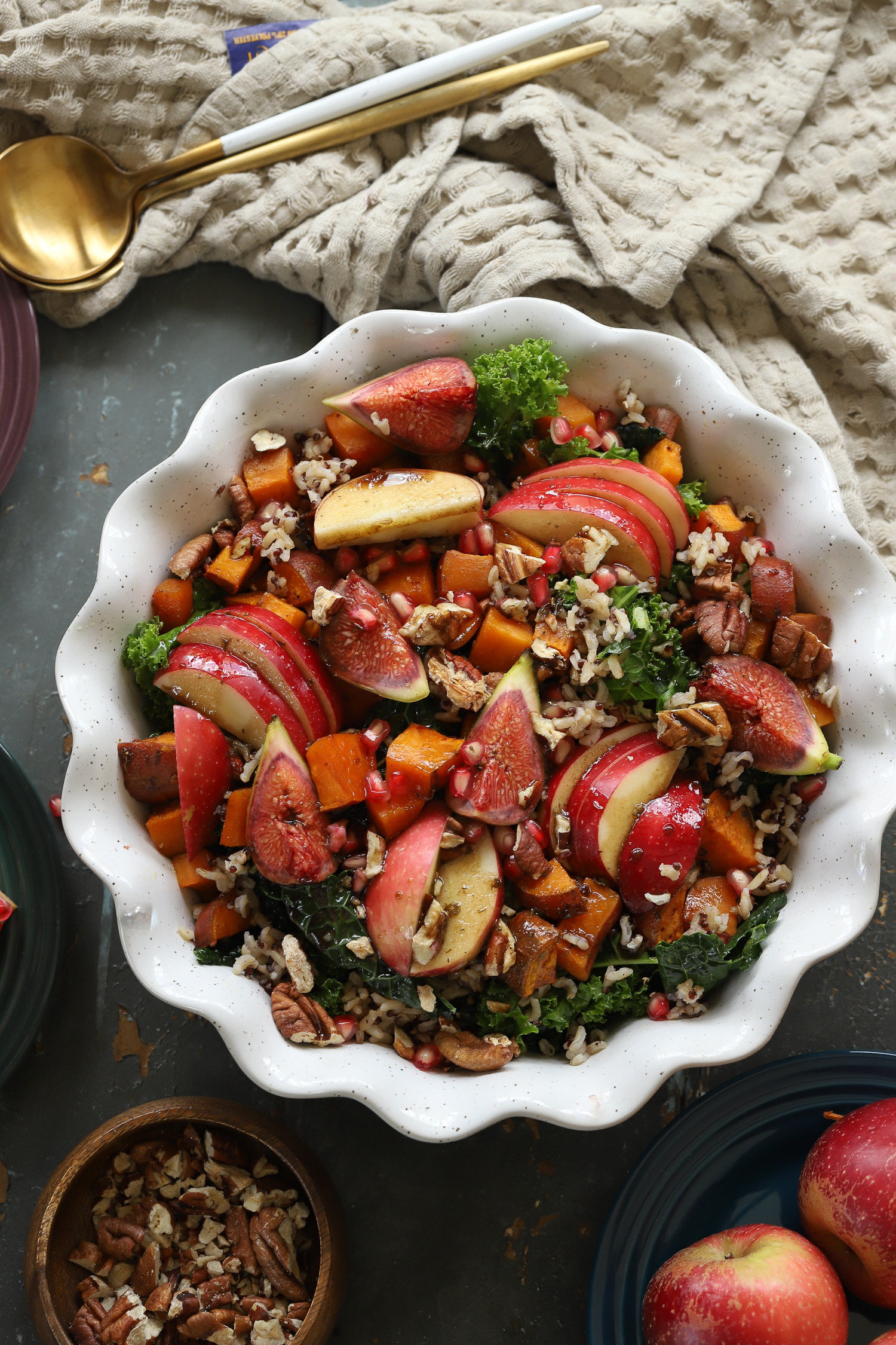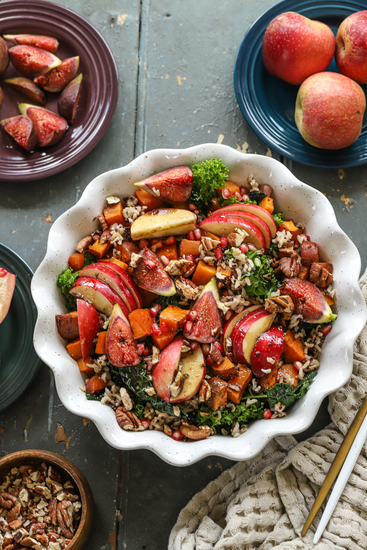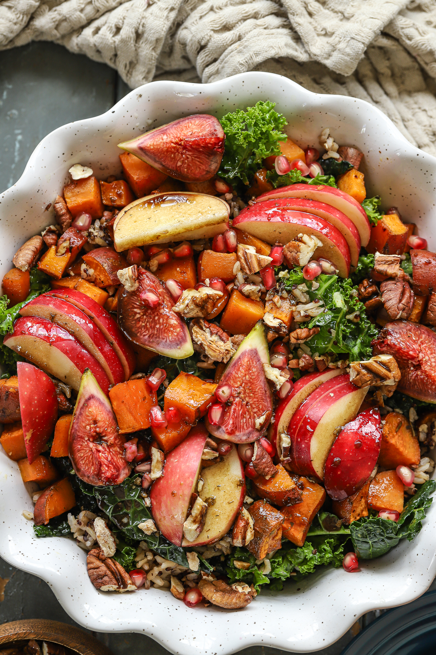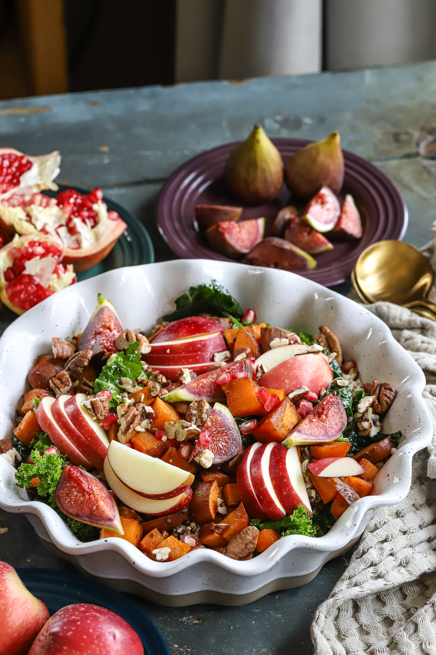 6. Layer the salad: add the warm grains to the kale, followed by roasted sweet potatoes (slightly cooled), apples, figs, pecans, and pomegranate jewels.