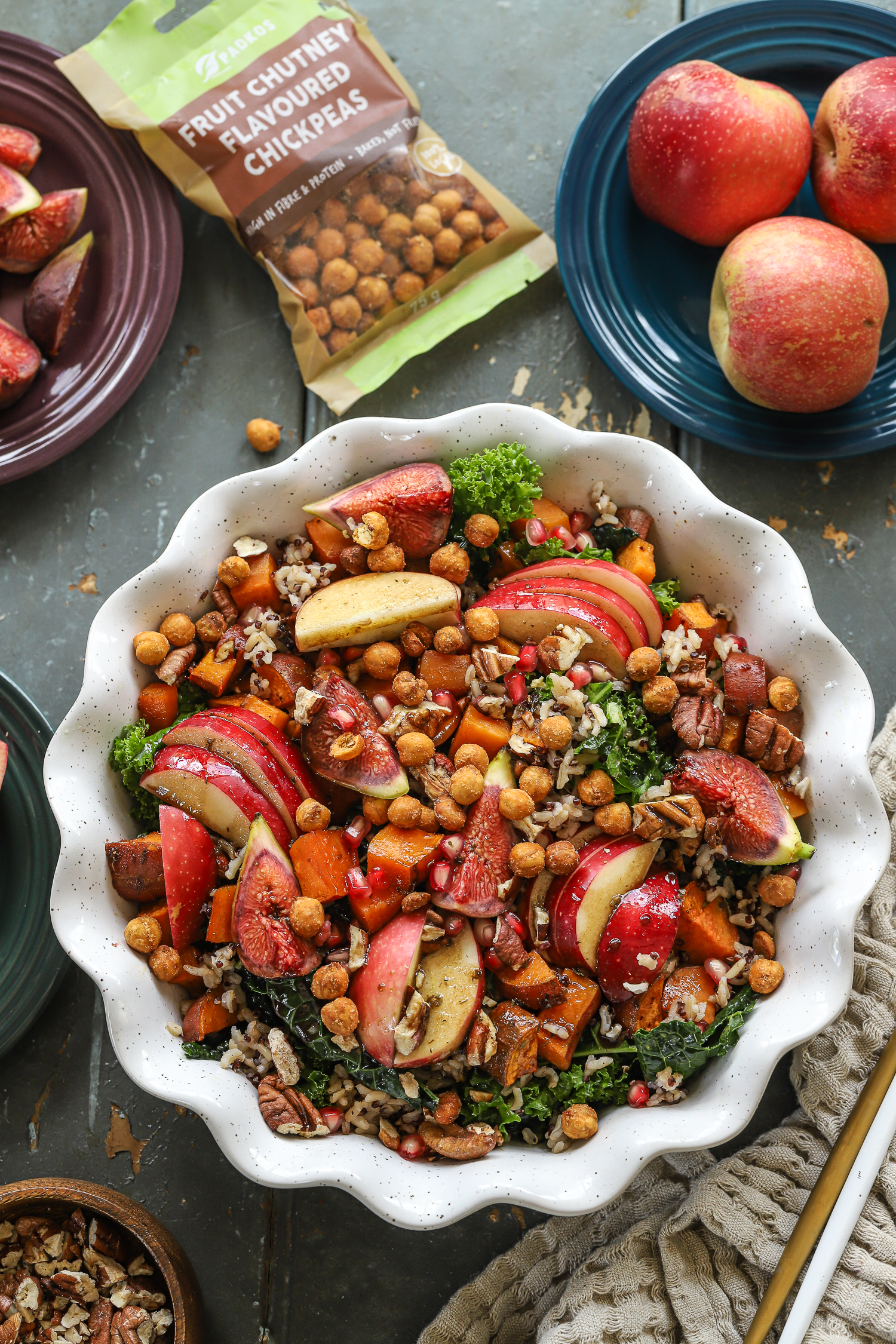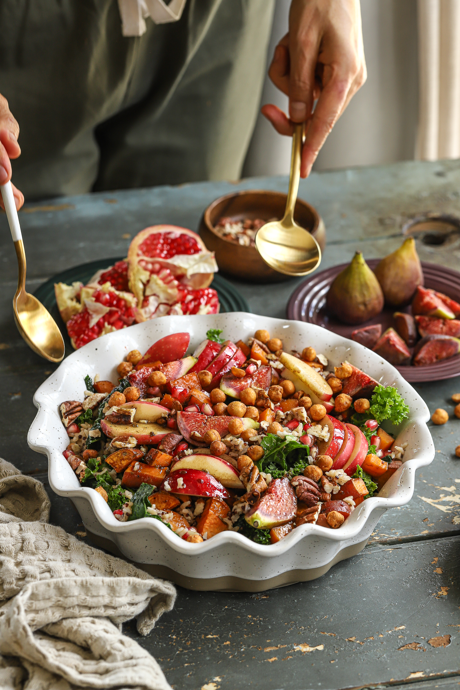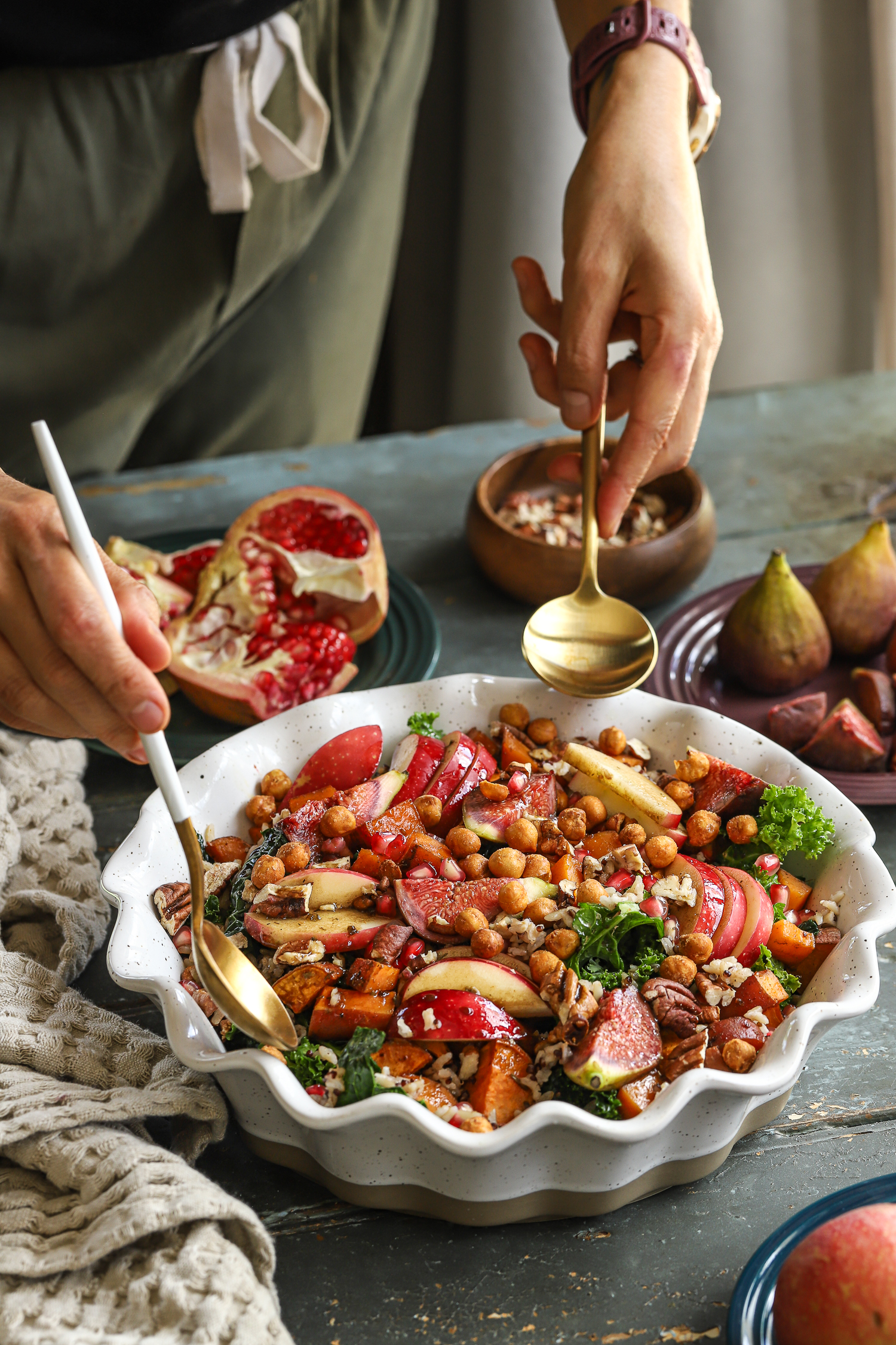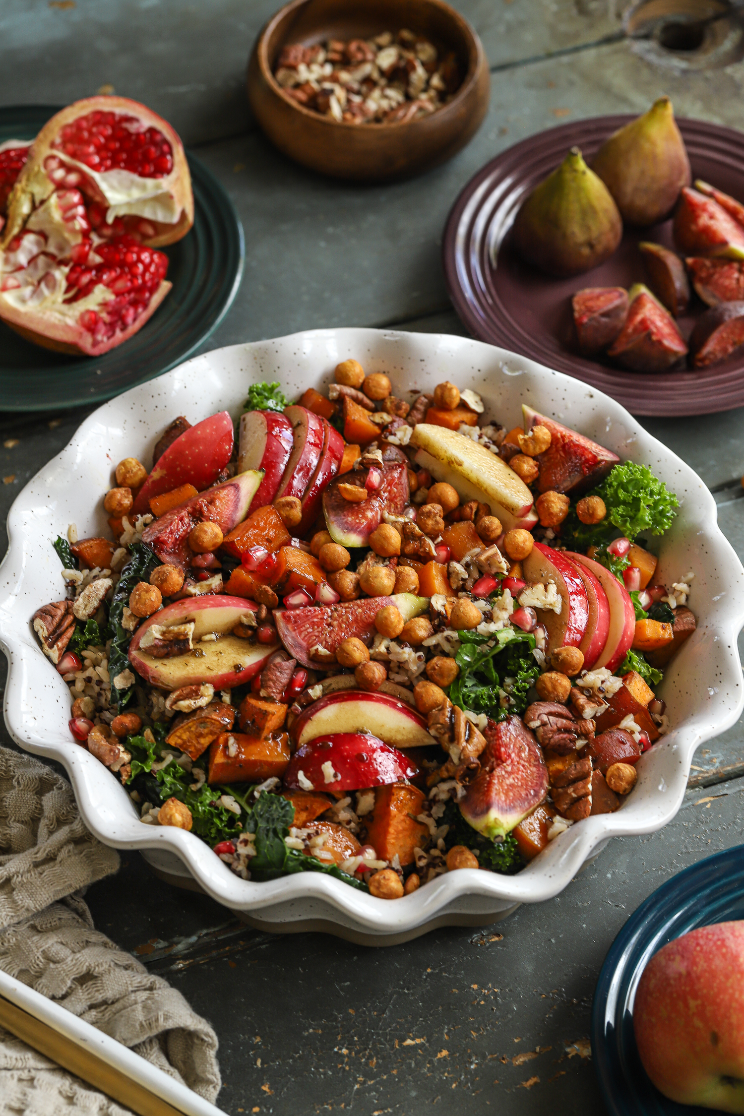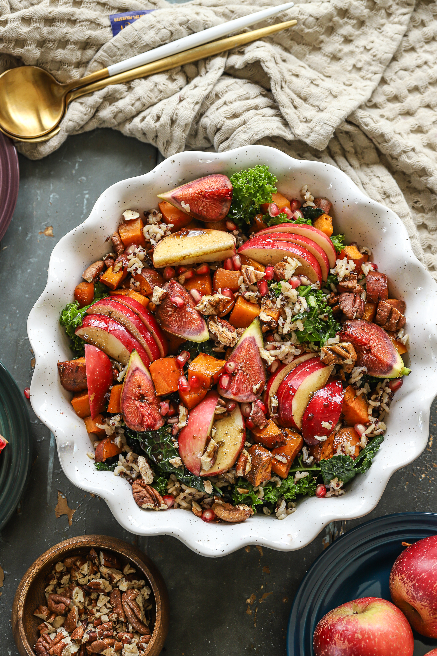 6. Layer the salad: add the warm grains to the kale, followed by roasted sweet potatoes (slightly cooled), apples, figs, pecans, and pomegranate jewels.