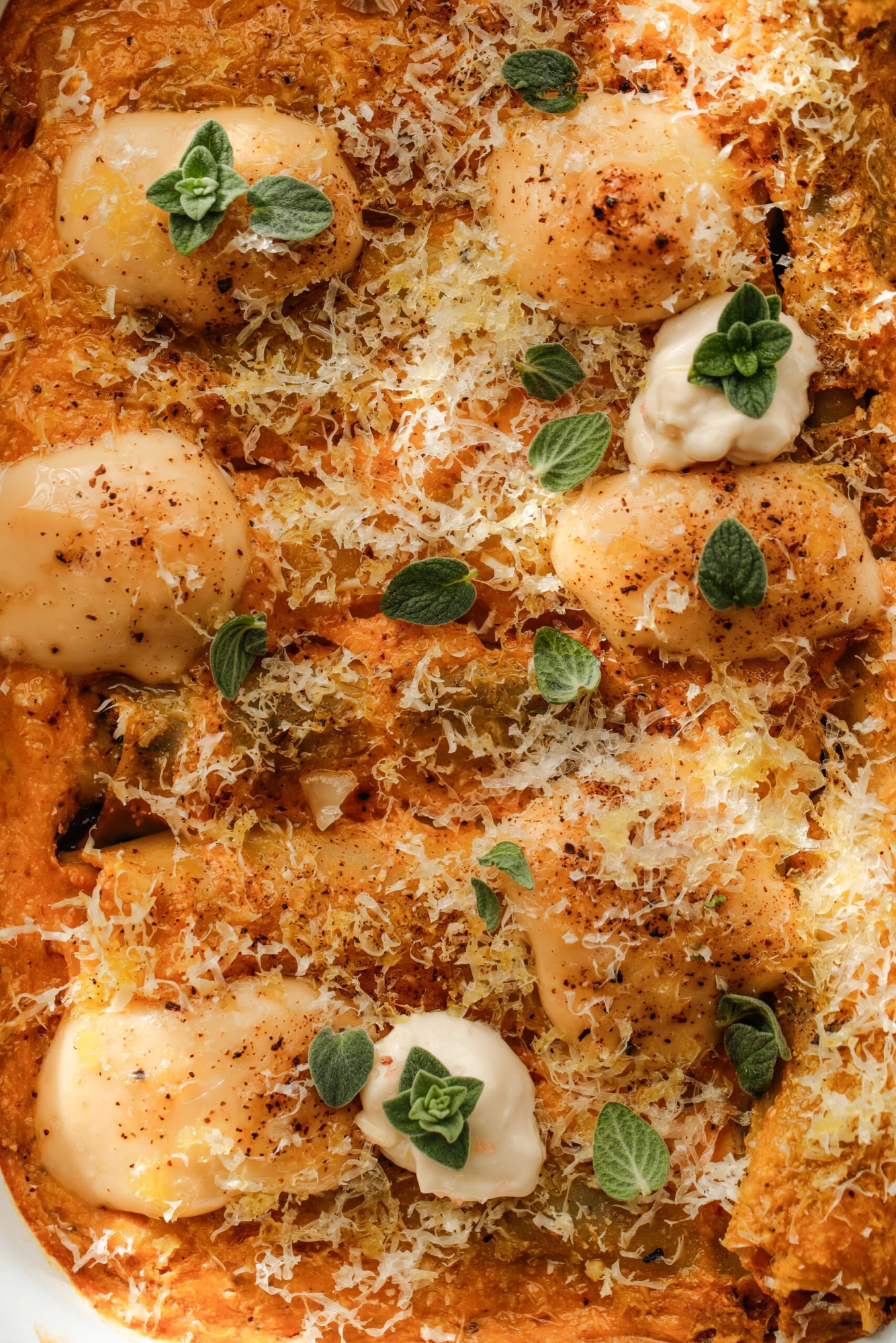 Blend the sauce ingredients until smooth, pour into a saucepan, and bring to a simmer until it starts to thicken, pour onto the lasagna roll up’s, and then add the grated vegan cheese and some breadcrumbs on top. Bake for about 25-30 minutes until brown, add a few dollops of the vegan cream cheese or the dip, and serve with the fresh herbs and a side salad.