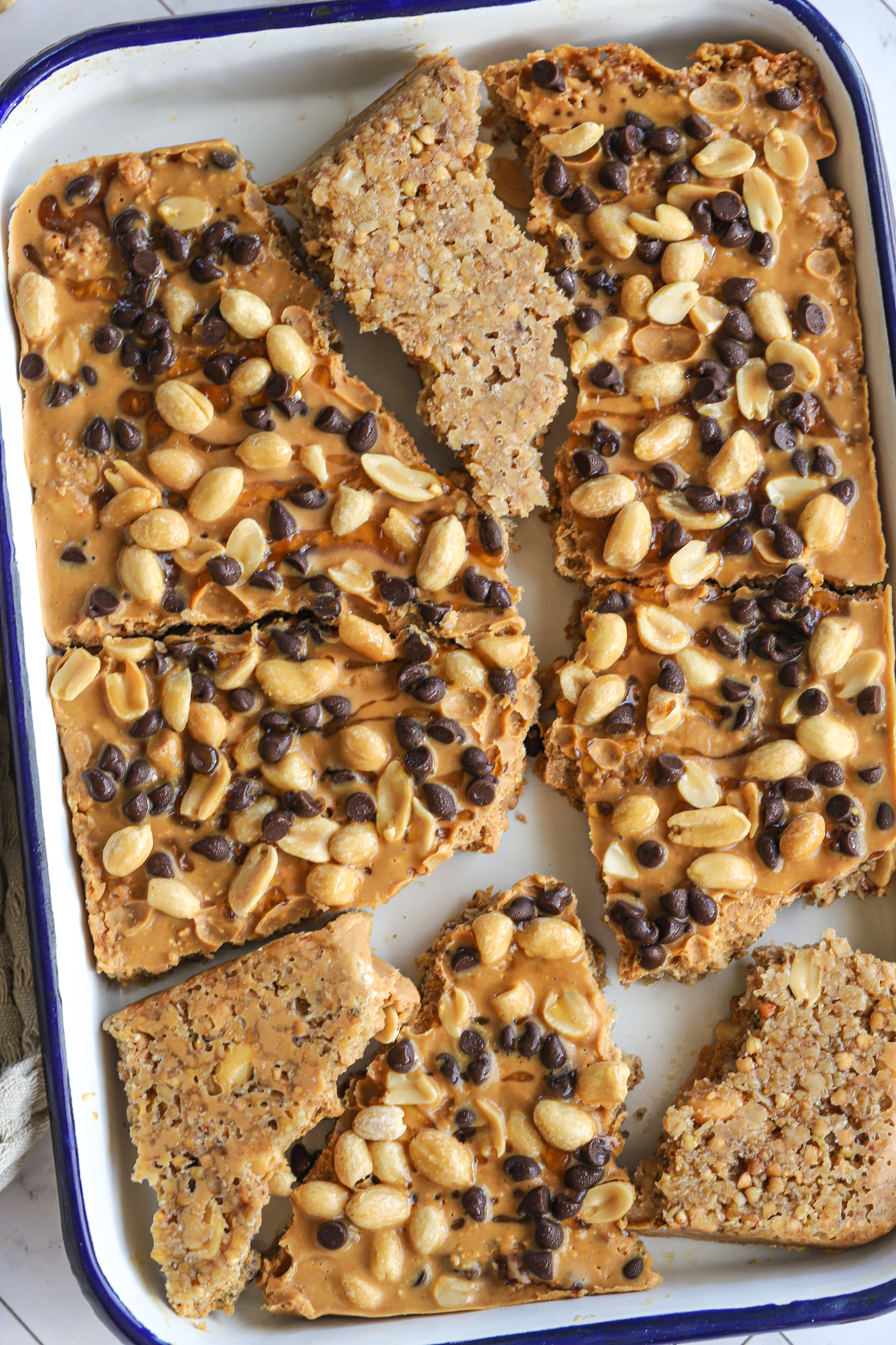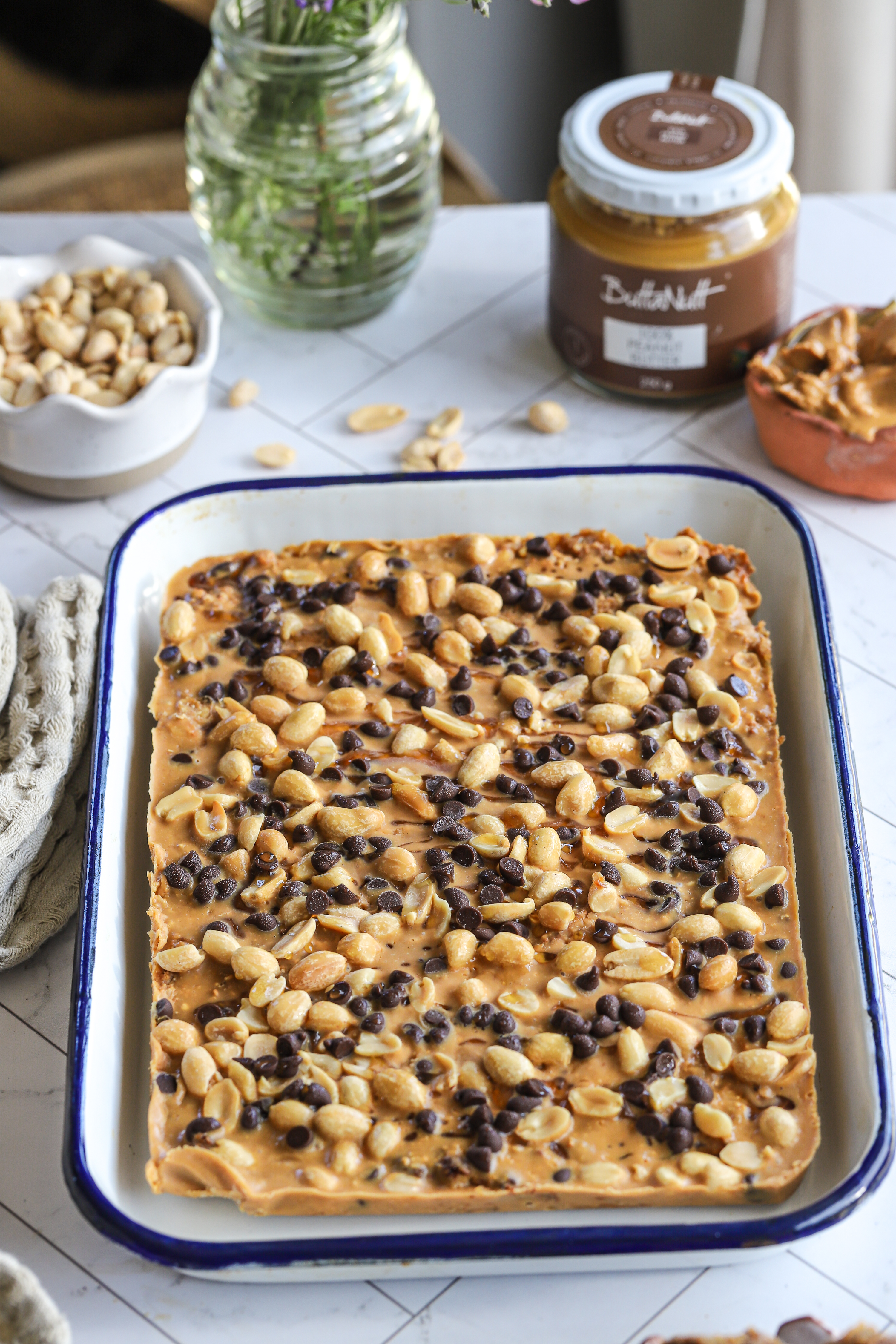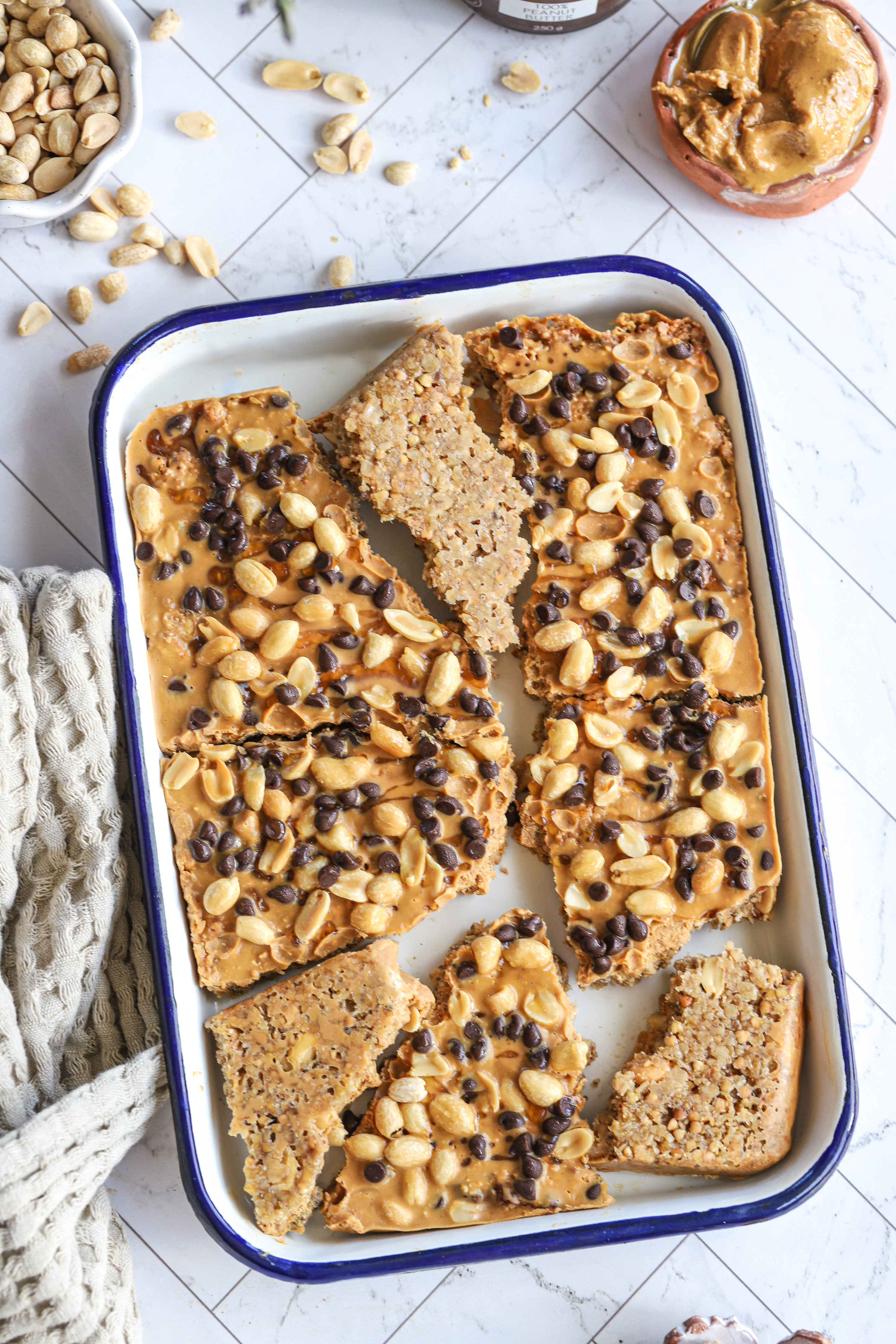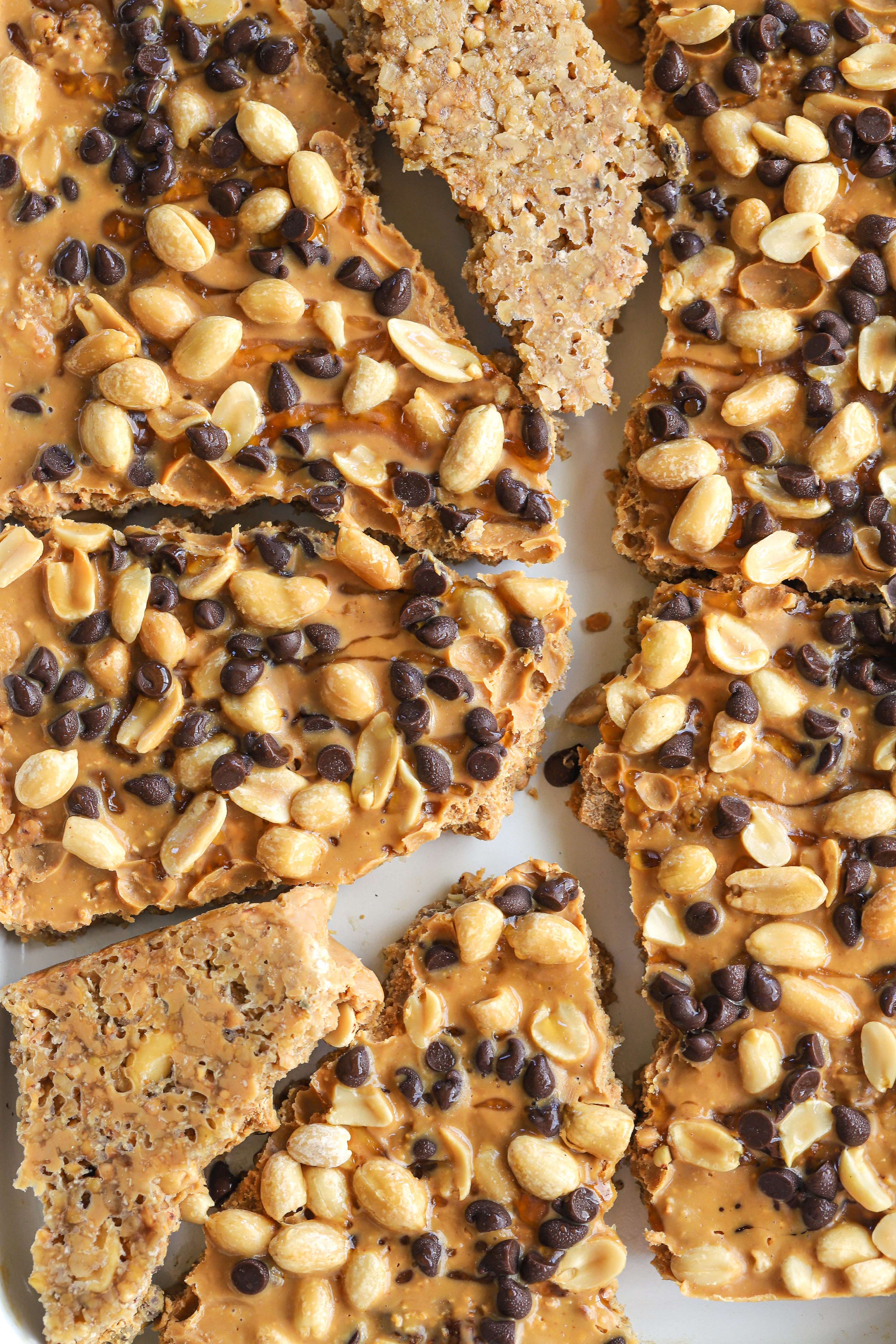 5. Then, melt the peanut butter layer together until smooth, pour it onto the bark base, then top the bark with the peanuts, chocolate chips, and drizzle with some honey and freeze again until set.