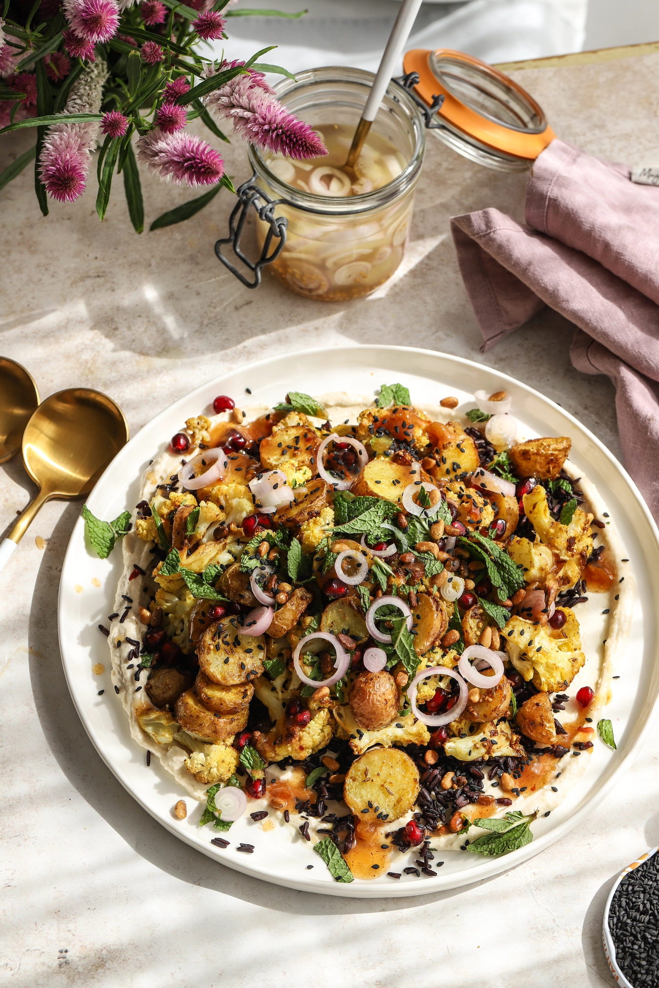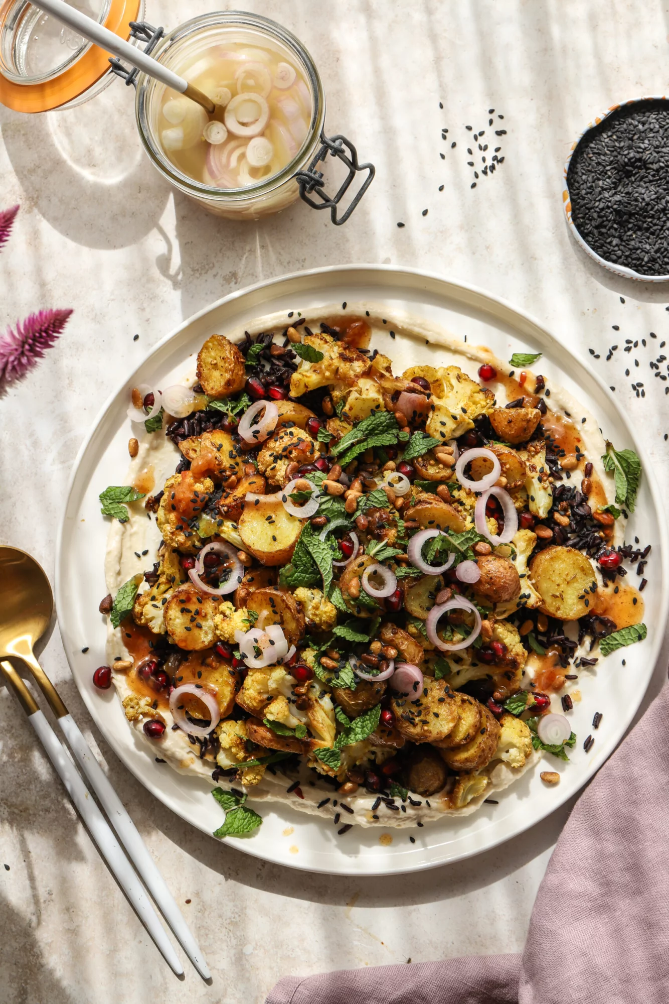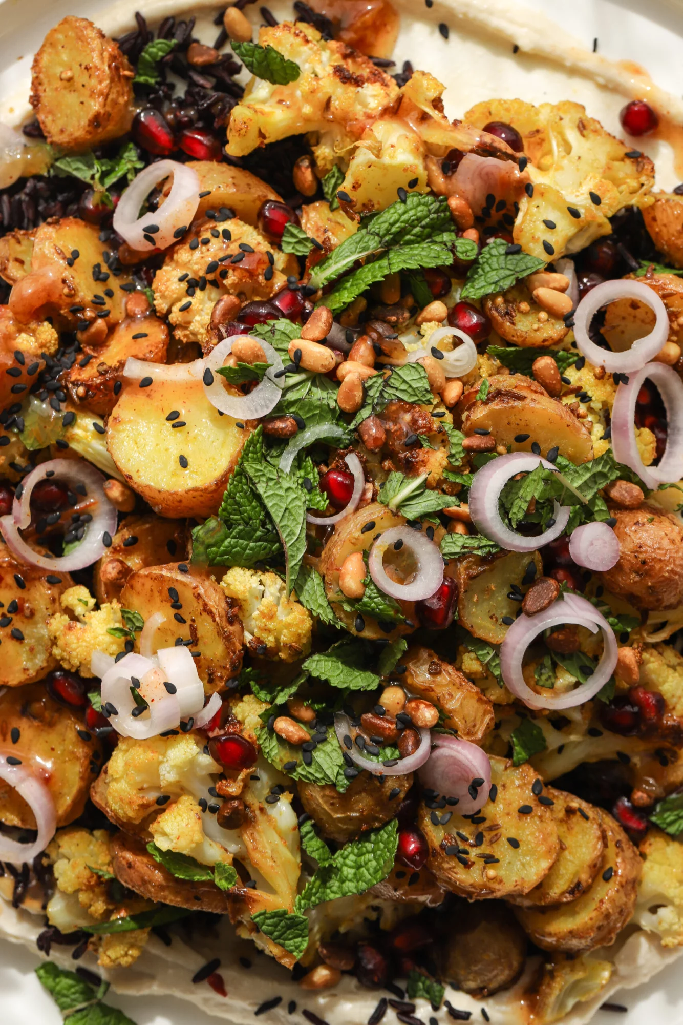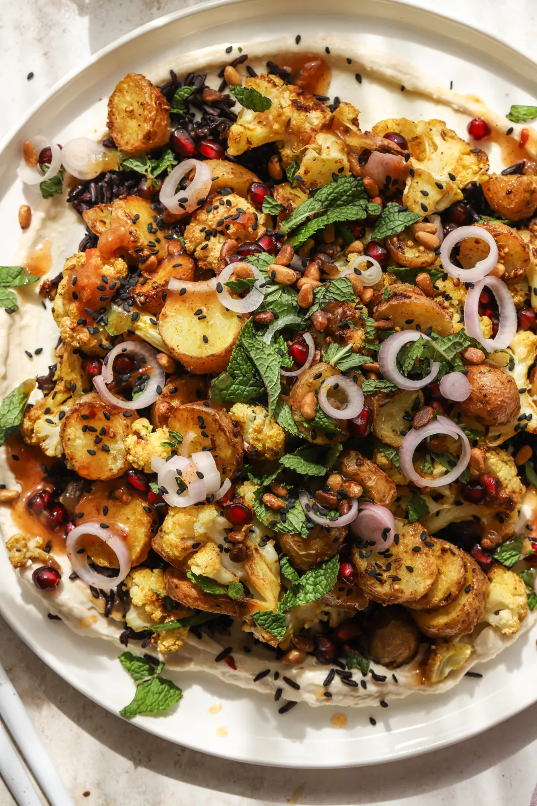 4. Mix the hummus and cream cheese, add to a plate, then the toasted black rice, roasted curry vegetables, pomegranate seeds, chopped mint, pickled shallots, sesame seeds, and pine nuts.
