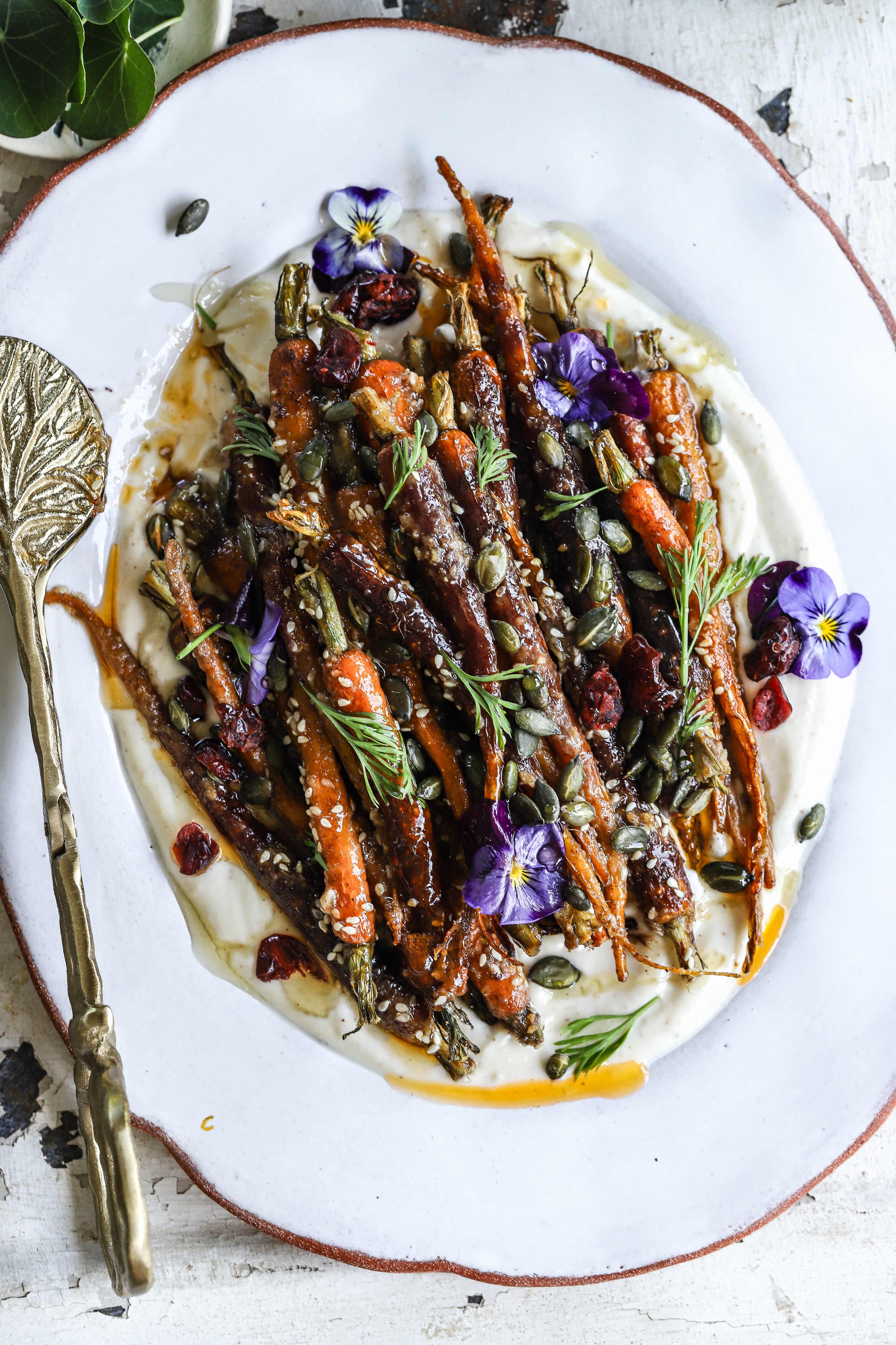 Mix the hummus and cream cheese, add to a plate, then the toasted black rice, roasted curry vegetables, pomegranate seeds, chopped mint, pickled shallots, sesame seeds, and pine nuts. 4. Mix the chutney dressing add on to the salad and enjoy!