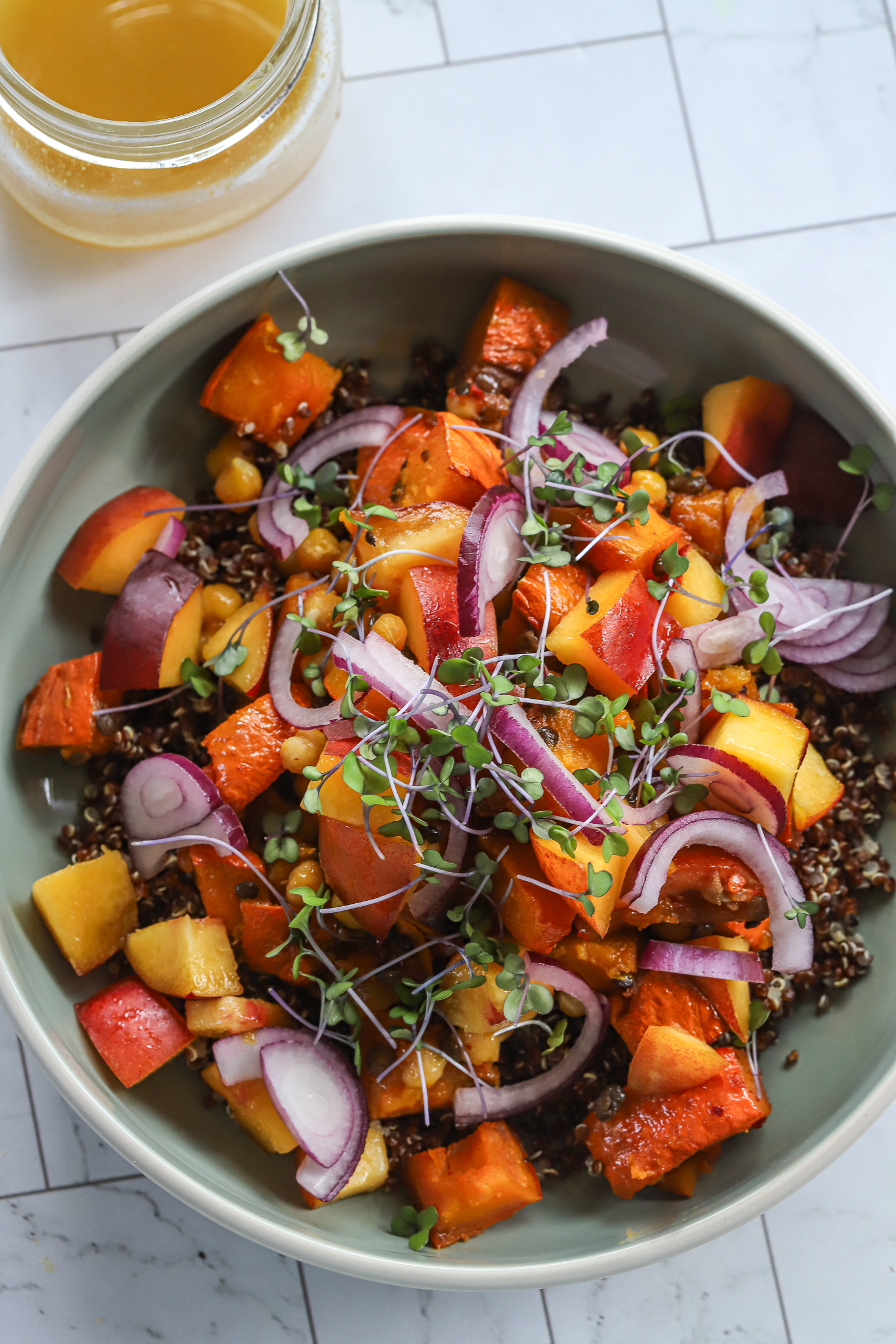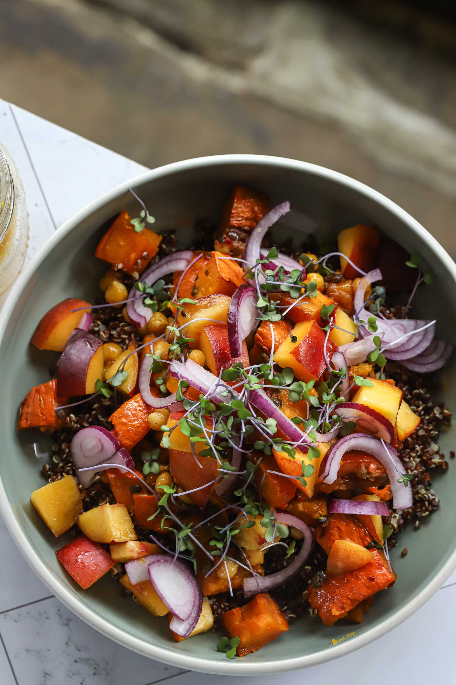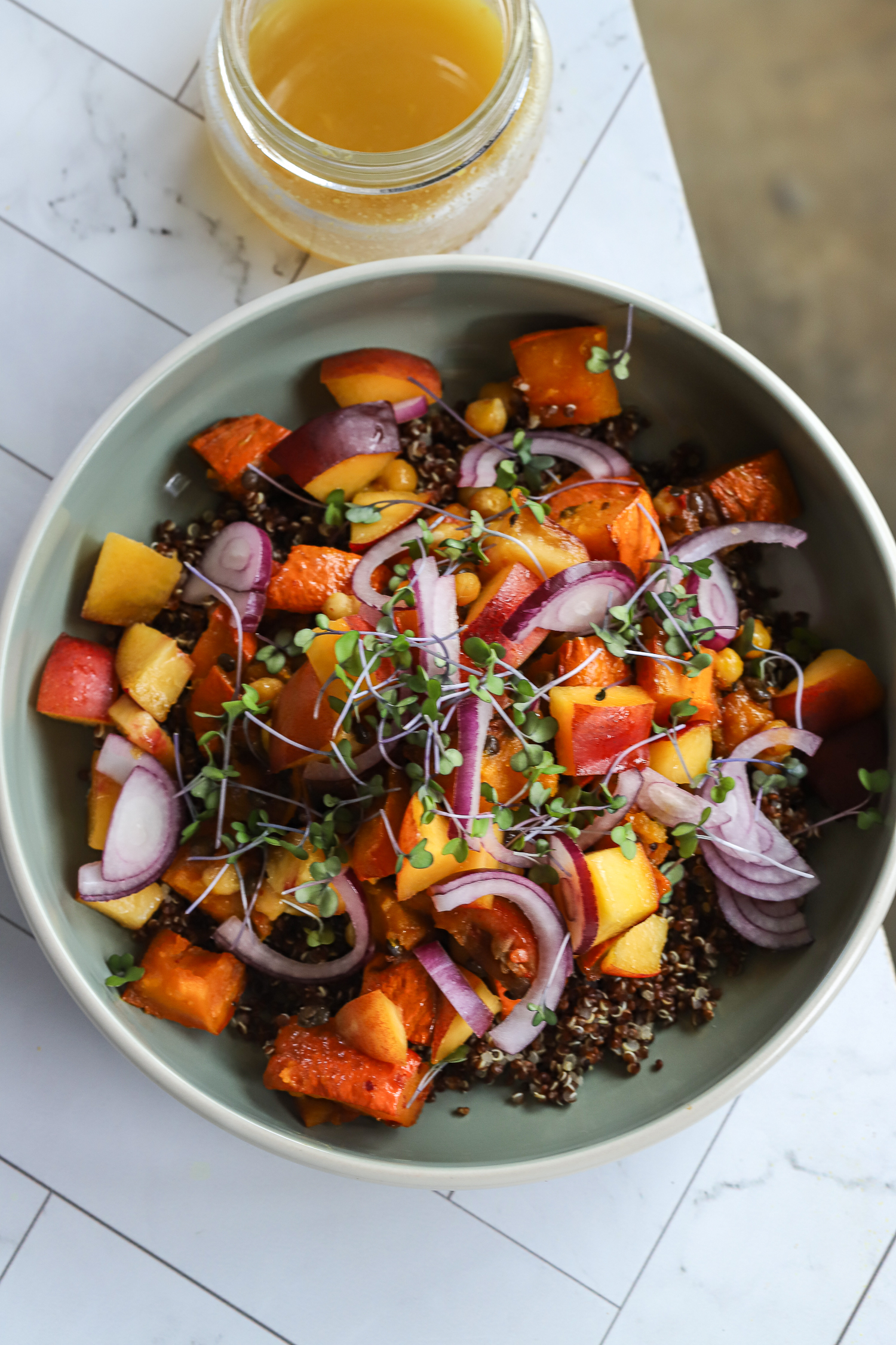 Bake for 20-25 minutes until jammy, serve on the cooked quinoa, add sliced nectarine cubes, mix the dressing and pour over the salad, and sprinkle on the red onion and sprouts.