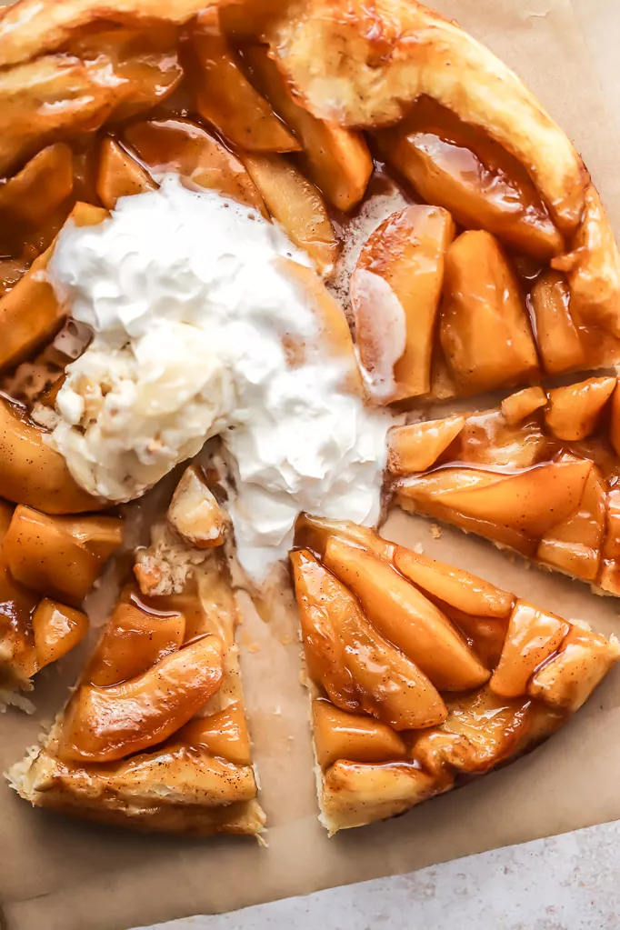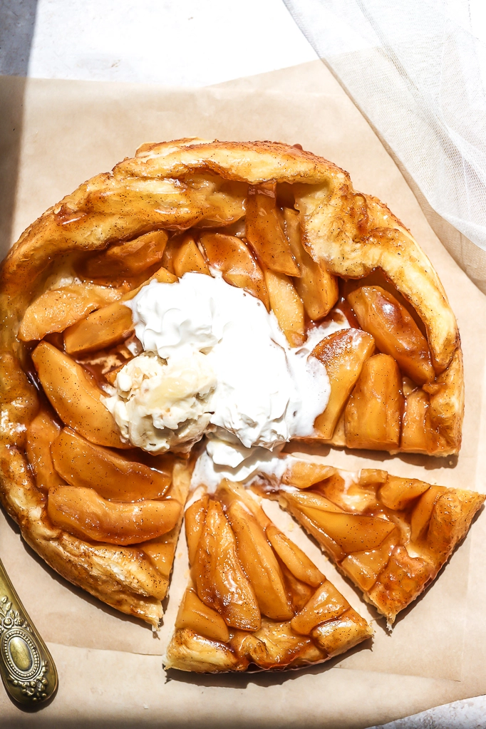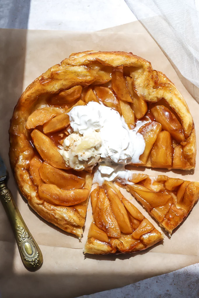 Remove to cool and then flip over onto a plate, gently remove the tin, and serve the galette with ice cream and whipped coconut cream.