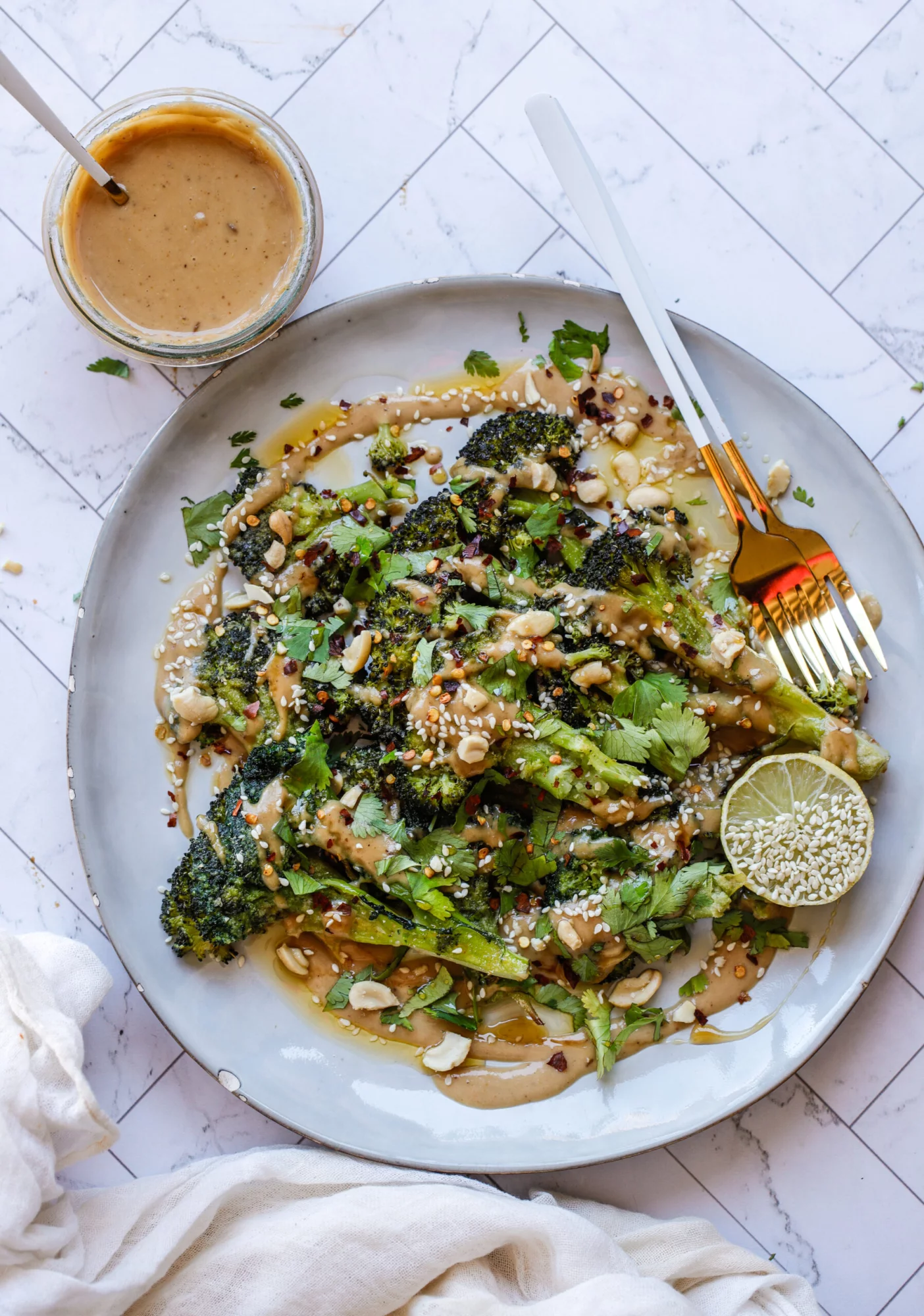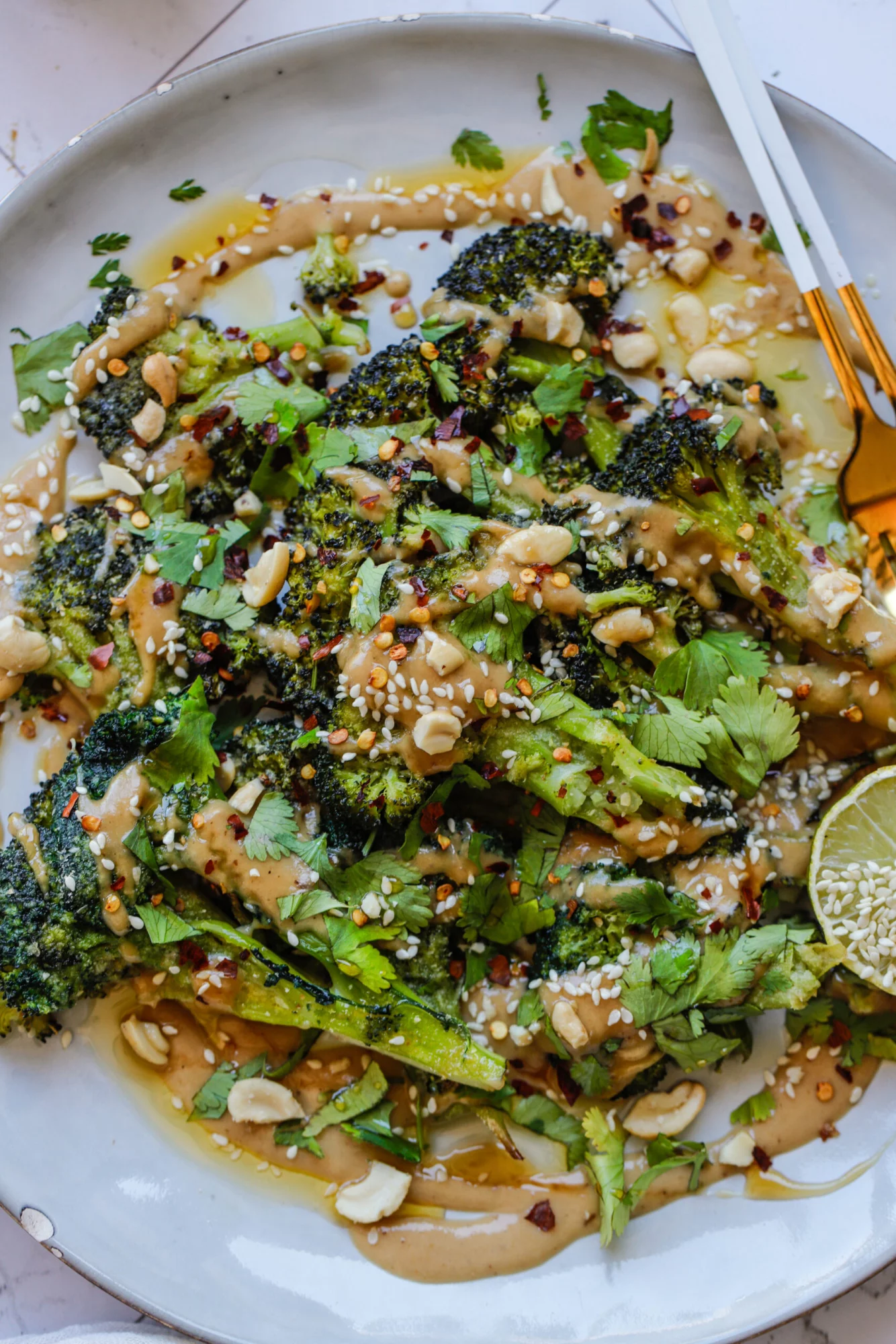 3. Blend or mix the dressing ingredients and drizzle over the broccoli just before serving, along with the chopped salted cashews, toasted sesame seeds, chili oil, chili flakes, a splash of lime or lemon juice, and the chopped cilantro.