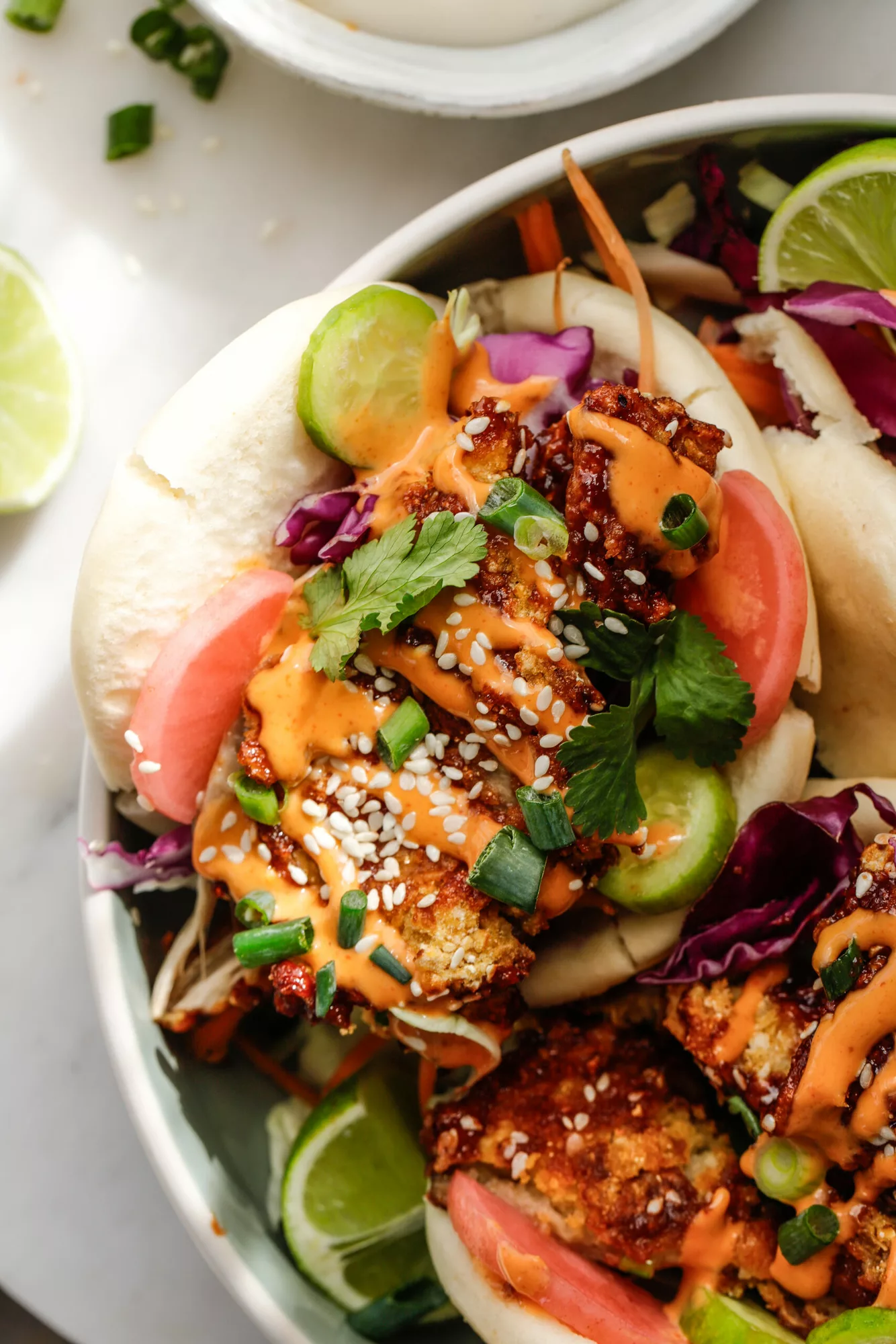 For the mayo, just mix the Sriracha and vegan mayonnaise until smooth, add generous drizzles on the Bao buns and serve.