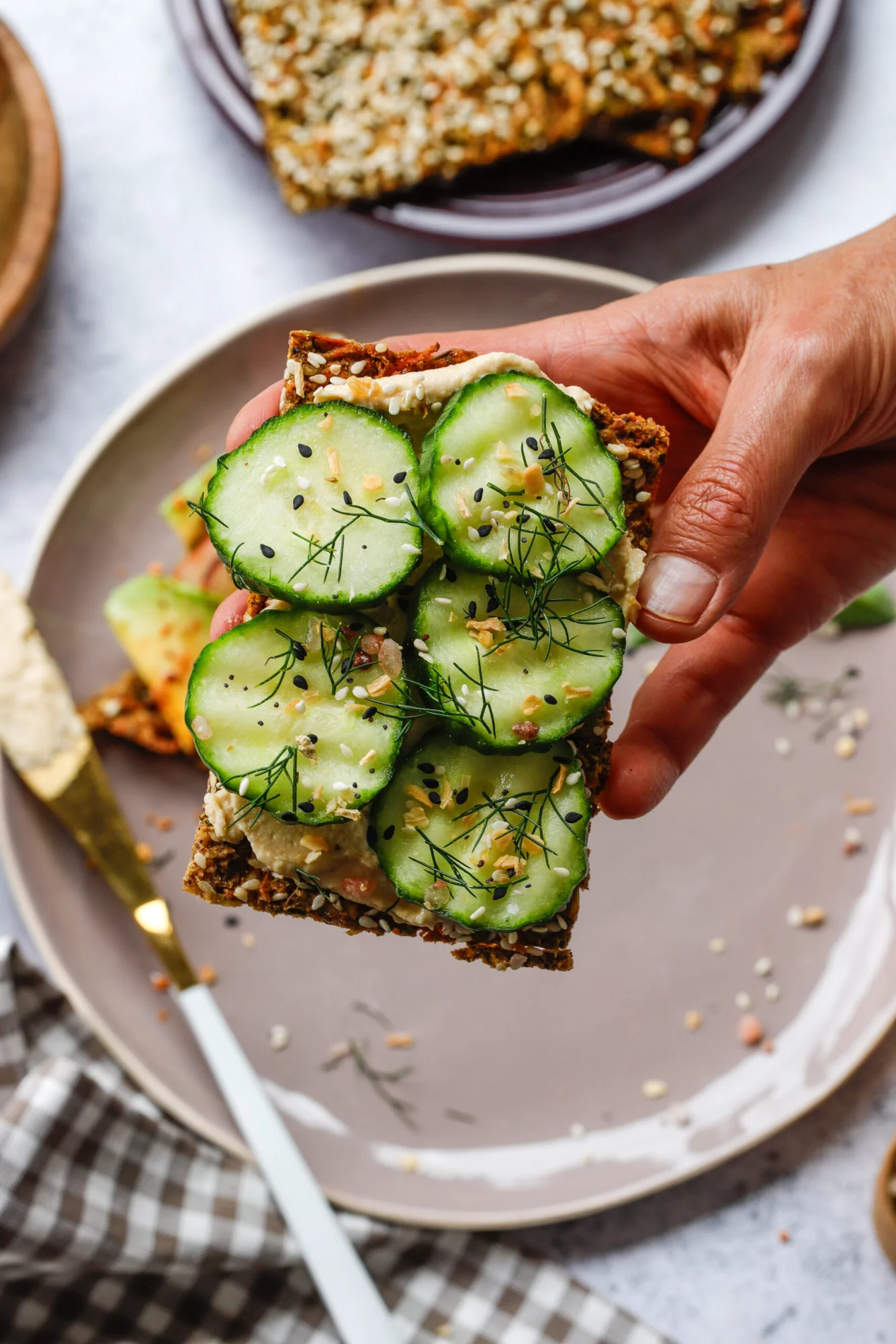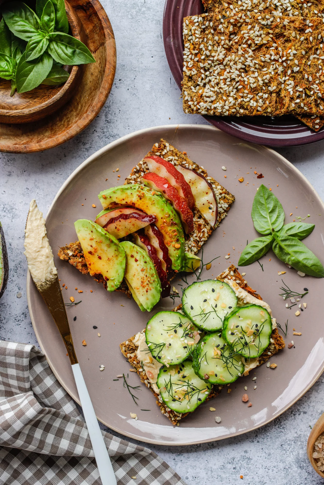 4. Add your desired toppings, like hummus, cucumber, bagel seasoning, and salt, or something sweet like peaches, avocado, honey, and chili flakes.